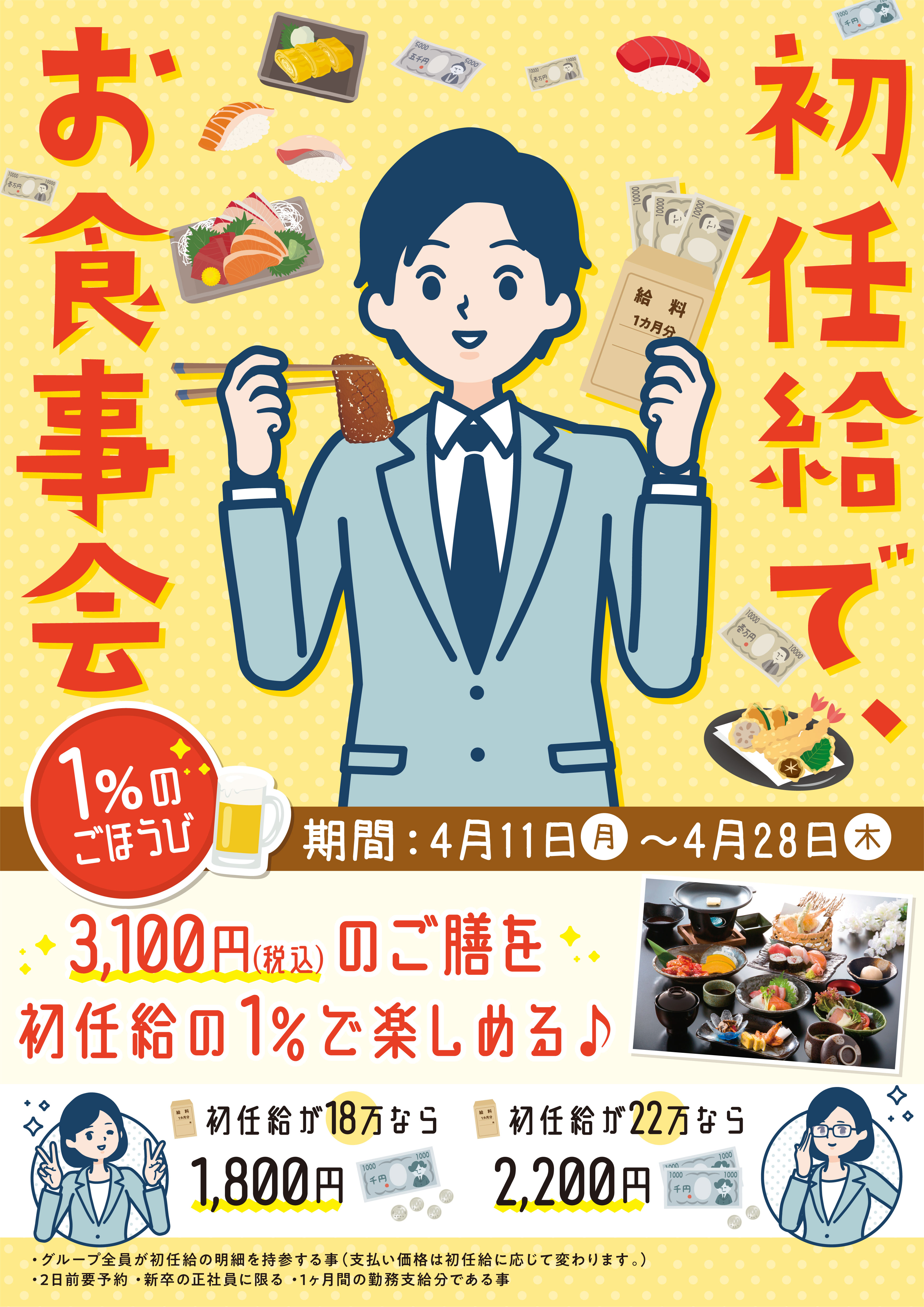 内 容:初任給(手取り)の1%の価格で「うたげ御膳」をご提供します
