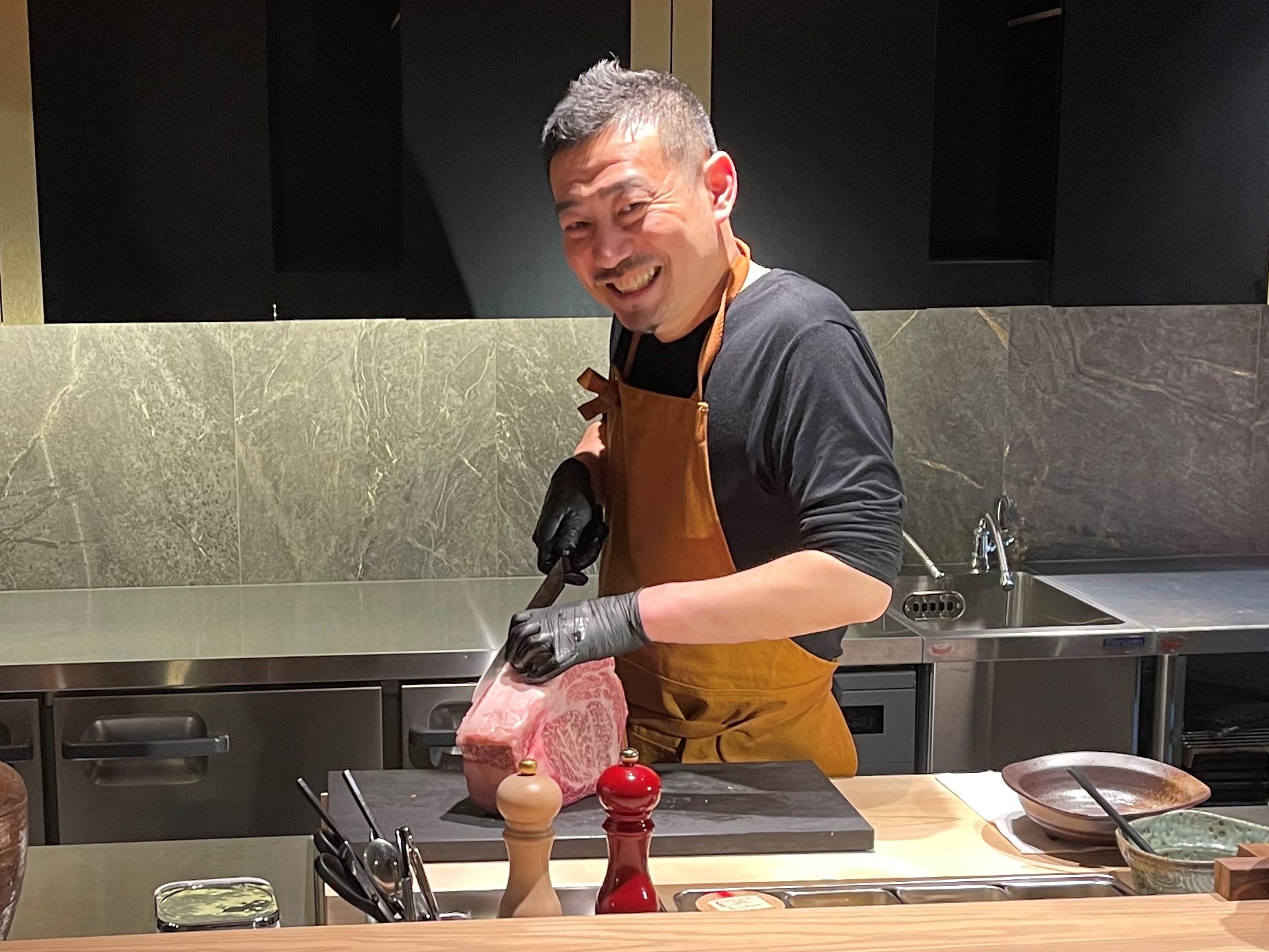 お店の入り口を開けるとすぐ目に入るお肉のショーケースはインパクト抜群。キレイなサシの入った上質なお肉を心ゆくまで眺めるもよし、撮影もよし、自由に楽しんでもらえたらと思います。