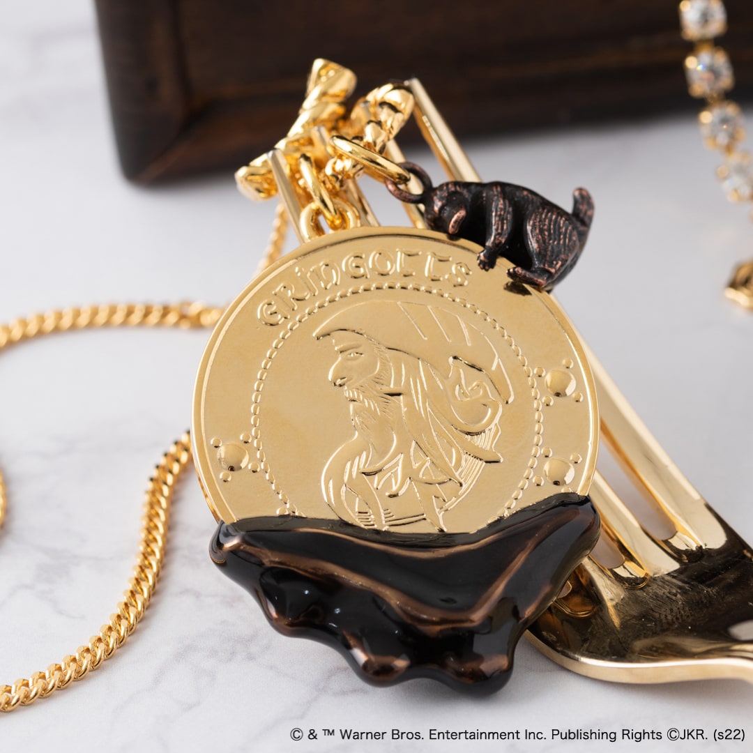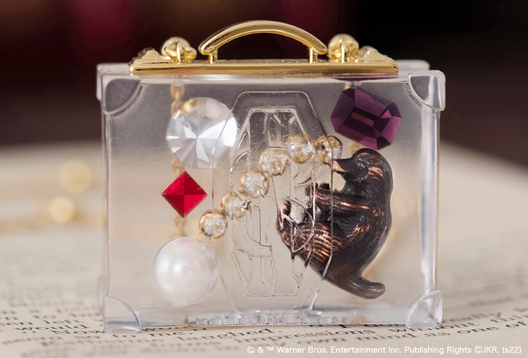 魔法動物学者の主⼈公・ニュート・スキャマンダーが肌身離さず⼿にしている⼤切なトランクがモチーフの「マジカルキャンディートランク ネックレス」は、ケースの中にキラキラと輝くものに惹きつけられてしまう愛嬌たっぷりな魔法動物・ニフラーと、ニフラーがコレクションしている宝⽯を封じ込めた。⽢いチョコレートに姿を変えたニフラーや宝⽯の数々・・・“お菓⼦”な魔法動物を探す旅に出かけたくなるQ-pot.らしいコンセプチュアルなアクセサリー。