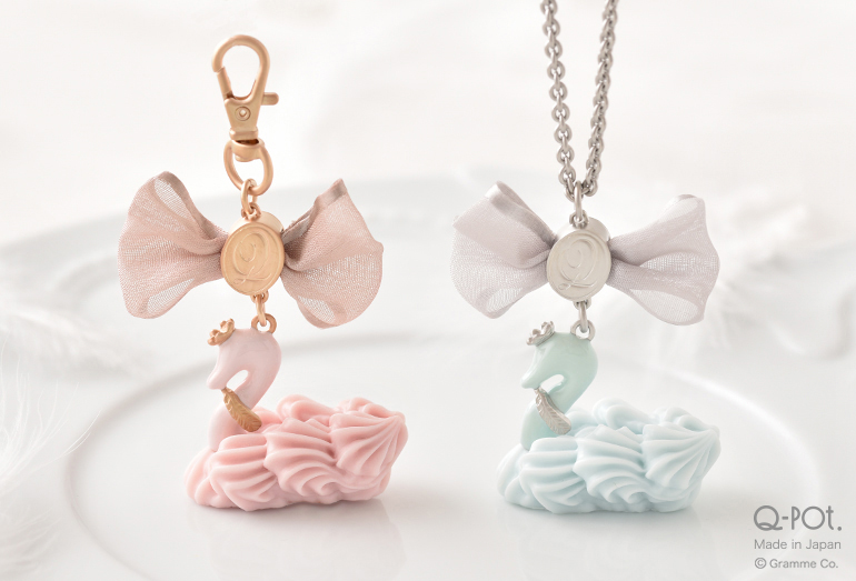 スイーツを中心に大人の甘さ広がる愛らしいデザインと特別な質感が魅力的な<Q-pot. Parlor>からは、時の経過とともに刻々と表情を変えていく幻想的な湖と、淡い湖の光の色に染まった美しい白鳥を表現した、王家に伝わる伝統の「Swan Lake Cake」が登場。シンボリックな白鳥を淡いパステルのバタークリームで表現したネックレスやバッグチャームは、朝もやに包まれる幻想的な湖をブルースワン、淡いピンク色に染まった夕暮れ時の湖をピンクスワン・・・と光の色に染まった白鳥を4色のバタークリームケーキで表現。バレリーナのチュチュをイメージした軽やかなリボンや気品溢れる王冠、羽のモチーフを飾った。合わせて、スワンの羽のようにエレガントにデコレーションされたバタークリームのピアス&イヤリングもラインアップ。