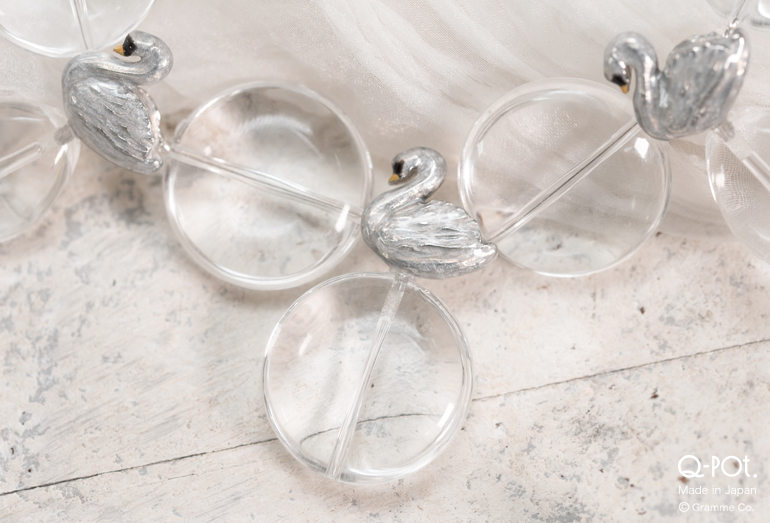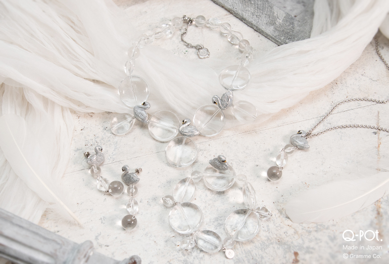白鳥が羽を休めに立ち寄る湖を舞台に、美しい湖とピュアな白鳥をイメージした<Q-pot. PRODUCTS>の「Swan Lake」は、 次の場所(夢)に羽ばたくまでのひと時の休息のように、全てを洗い流してくれるような癒しのアクセサリー。光に揺らめく透明感溢れるネックレスやブレスレット、ゆらゆらと揺れる雫が美しいピアスやイヤリングがラインアップ。上品な光を帯びて輝きを放つ白鳥は、艶めくエポキシ樹脂にグリッター感のある光の粒を織り交ぜ、一羽ずつ丁寧に着色。Made in Japanだからこそ叶った、白鳥の繊細なディティールにも注目して。