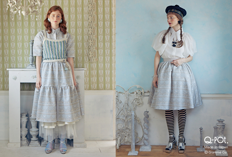 Q-pot.のアパレルライン<Q-pot. Dress>からは、朝もやに浮かぶ幻想的なブルースワンと夕暮れに染まるロマンティックなピンクスワンをイメージした、淡いパステルカラーのワンピースやスカート、ドレスシャツがラインアップ。幾重にも重なるエレガントなクリームとシンボリックなスワンがデコレーションされた、シュガークラフトケーキのような上品な佇まいの「Swan Lake Cake」テキスタイルは、クラシカルで幻想的な雰囲気。