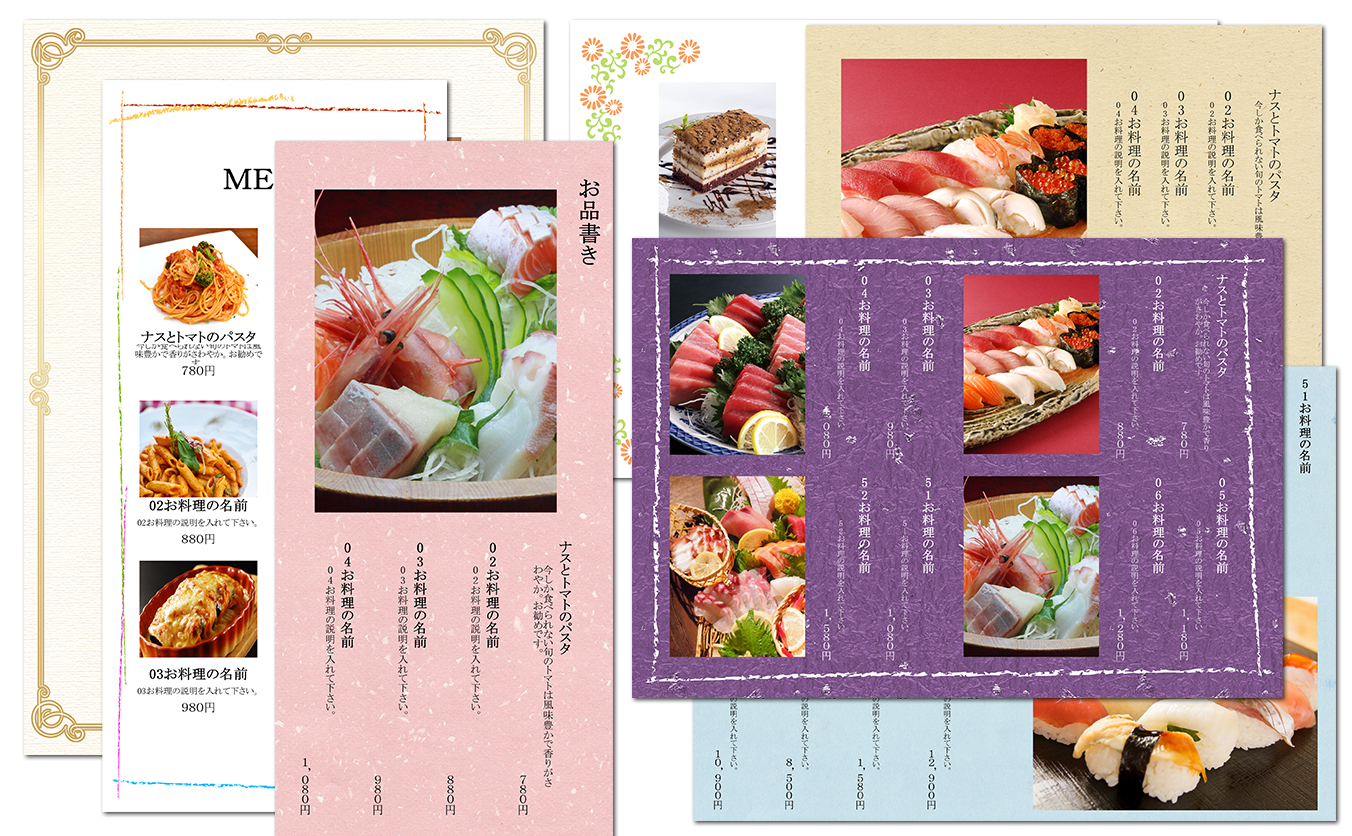 1. 和食・洋食・中華・カフェ等ジャンルを問わない様々なメニュー表が作成できます