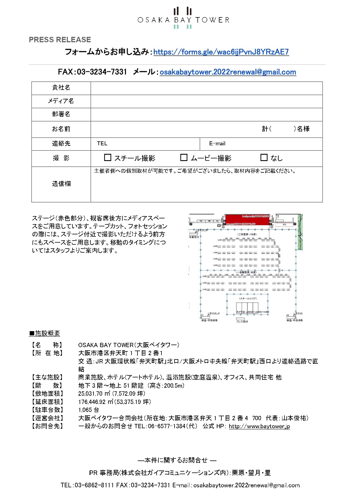スペースに限りがございますので、先着順でのご案内となります。取材をご希望される場合は、以下の専用フォーム、メールまたはFAXメールにてお申し込みください。