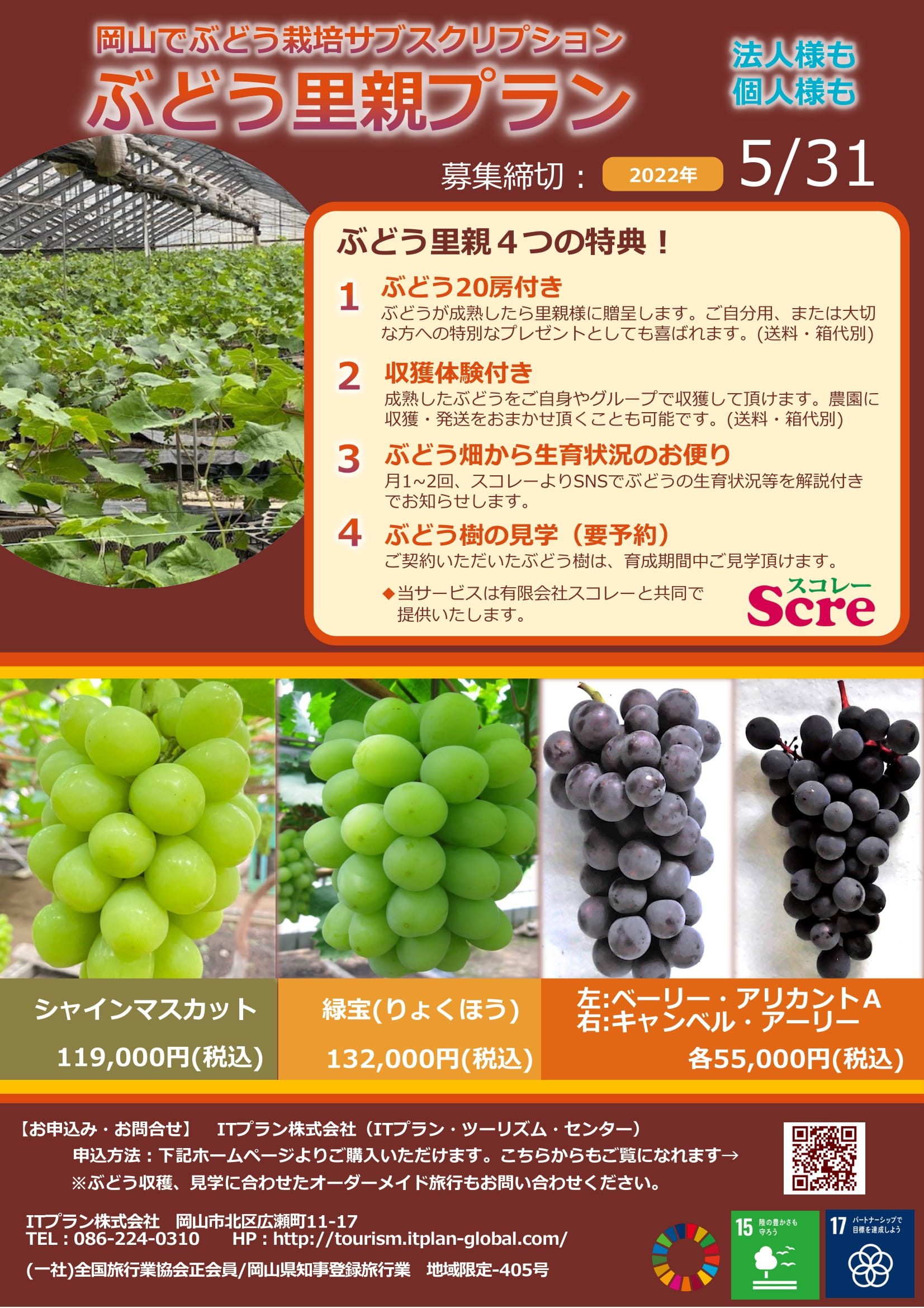 ITプラン株式会社(代表:太田記生)は、フルーツ農園・有限会社スコレー(代表:大内巌)と共同企画した「ぶどう里親プラン」の販売を開始いたします。