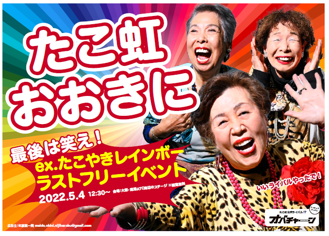 ●実は、オバチャーンとたこやきレインボーはデビュー当時から様々なイベントで何度も共演しており、たこ虹ファン(通称“虹家族”)のなかでもとってもなじみ深いアイドルでした。そんなオバチャーンさんに5 人へのはなむけとして是非ポスターにご出演いただきたい!とダメ元でお願いをしたところ、「深い縁のあるたこやきレインボーさんのためなら!」となんと出演費なしで今回のポスター撮影にご協力いただけることとなりました!