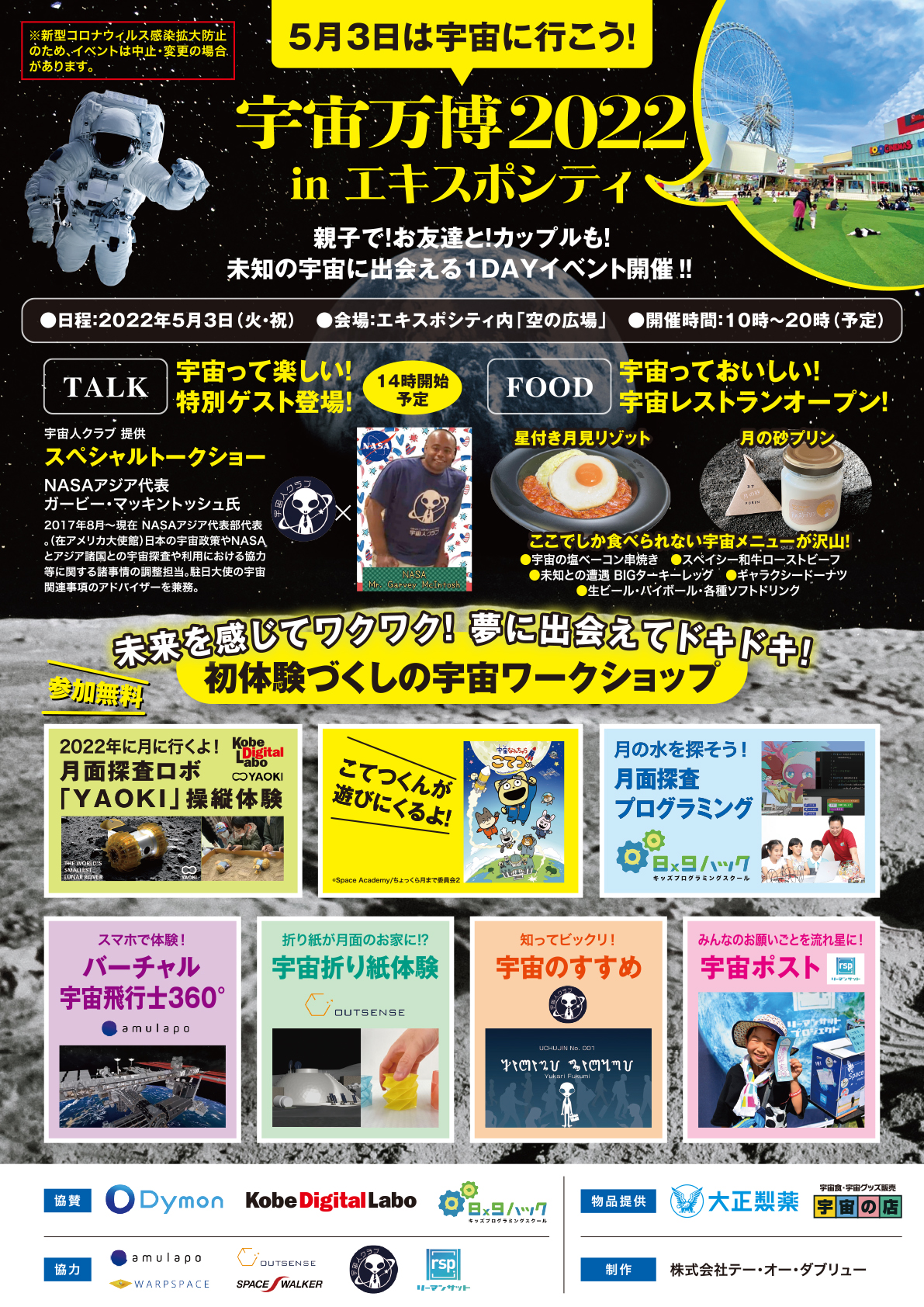 大阪万博跡地のEXPOCITY に立つ高さ日本一の大観覧車「オオサカホイール」(EXPO観覧車合同会社)は、2022年5月3日(火・祝)にEXPOCITY内「空の広場」での1日限定のオープンイベント「宇宙万博2022 inエキスポシティ」を開催致します。