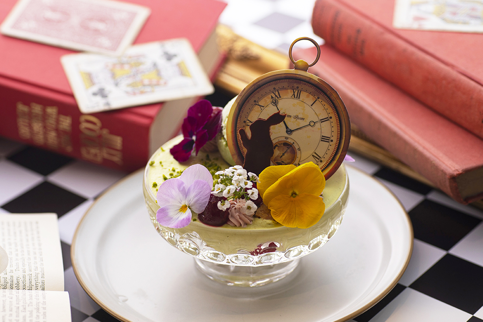 ピスタチオとチェリーをたっぷり使用した時計ウサギのパフェ。