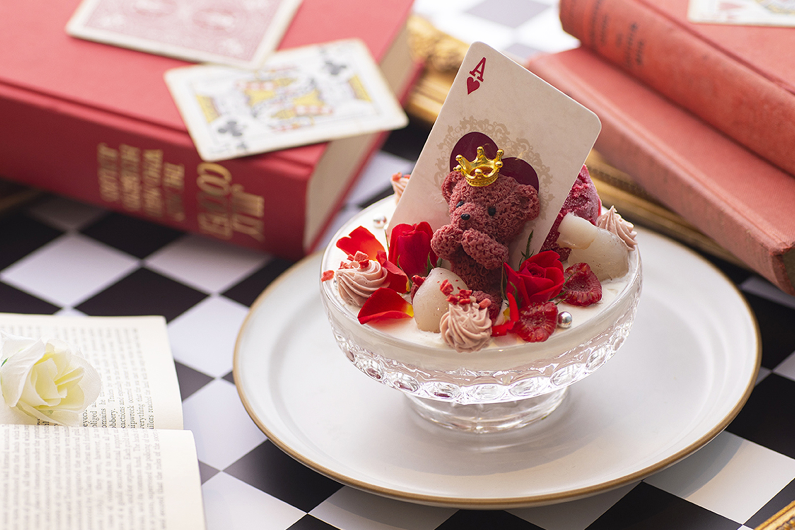薔薇やクリームなどをあしらい、くまチョコで可愛く仕上げたハートの女王のパフェ。
