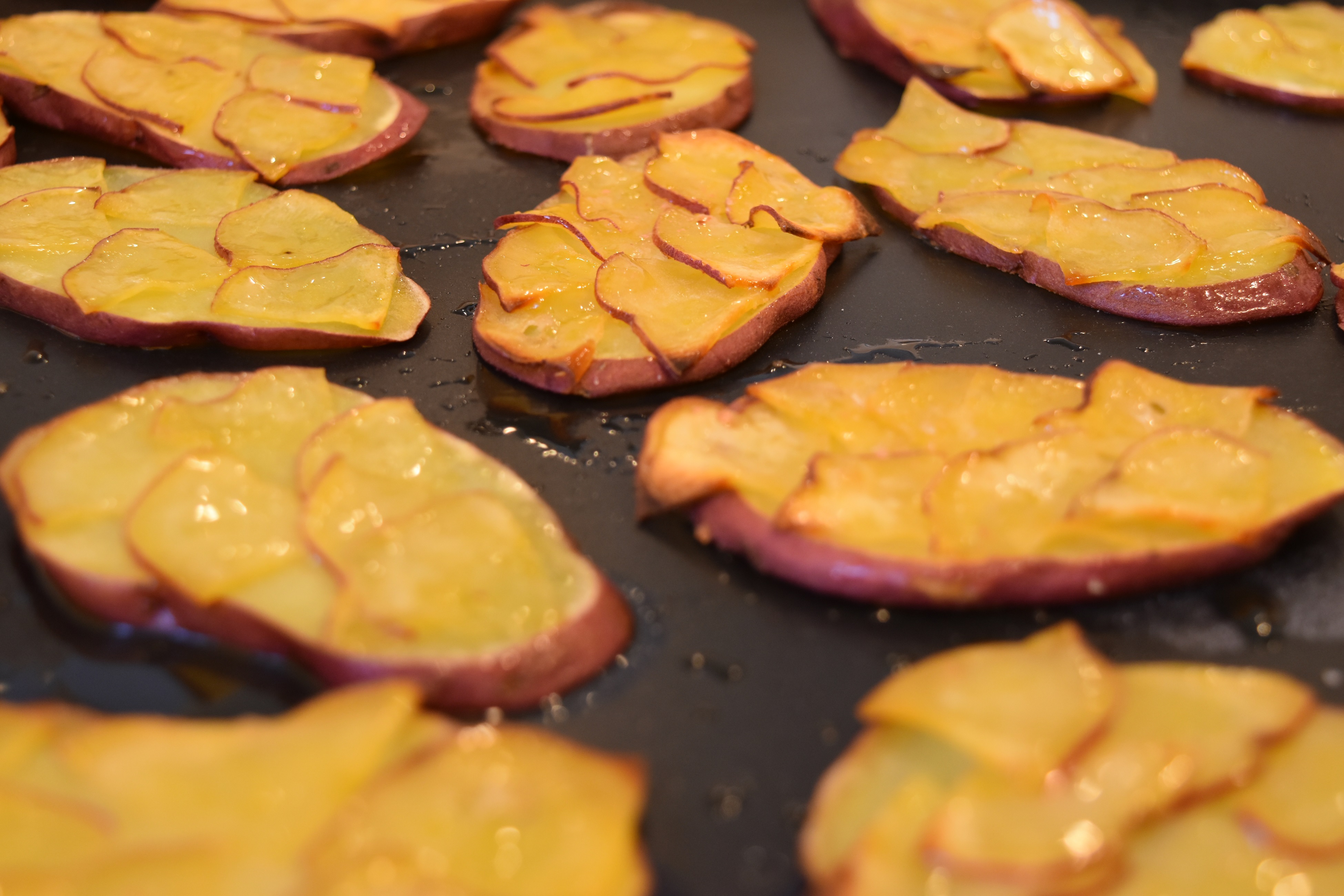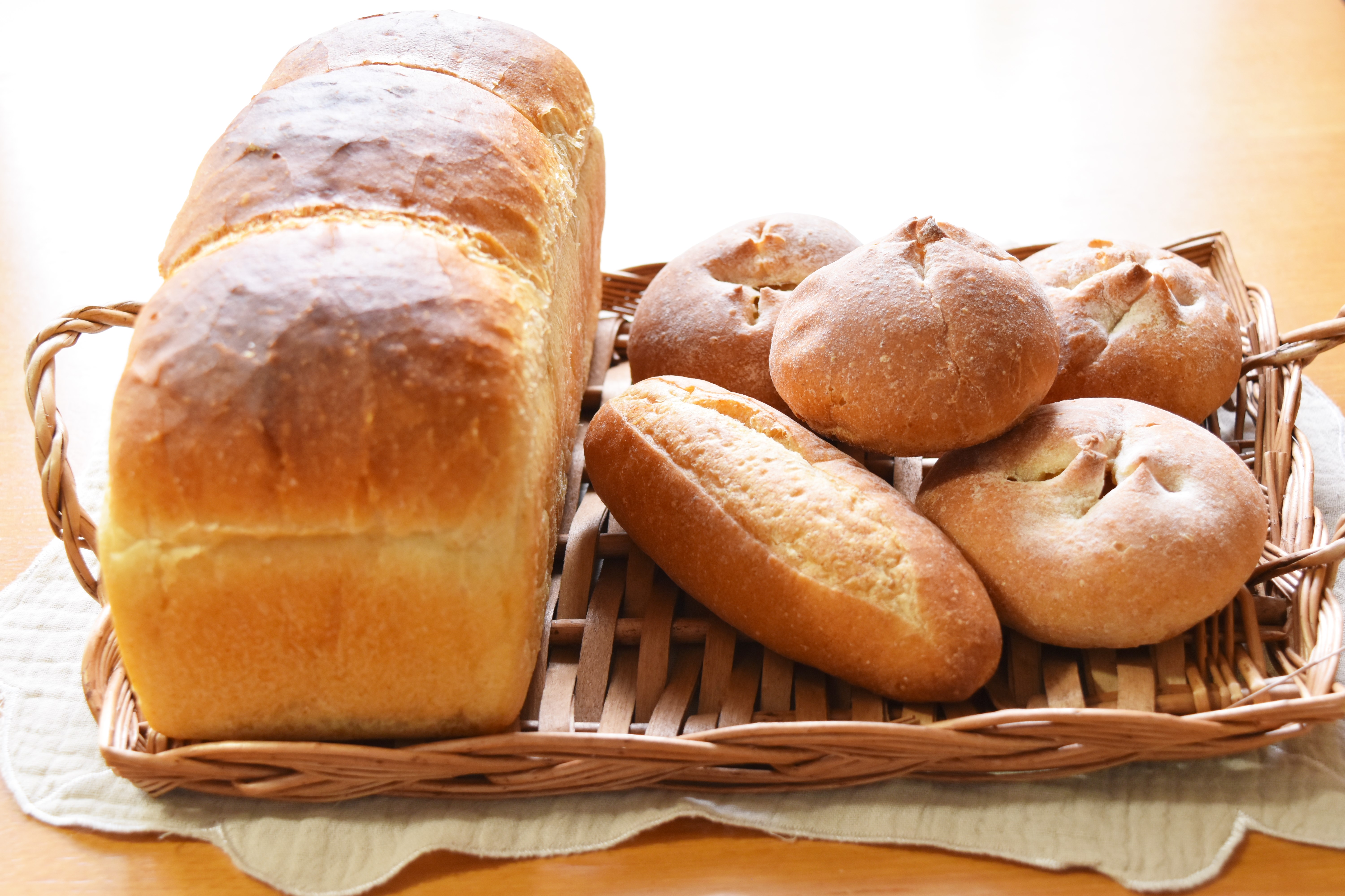 フレーバーバターを付けて楽しんでいただきたい、さつまいもをオリーブオイル、えごま油、亜麻仁油を塗って焼いた「さつまいもトースト」(6枚、420円)や食パン(1斤、480円)、「ミニバゲット」(120円)のほか、「あんこパン」、「さつまパン」(各150円)などの焼きたてパンもご用意しております。