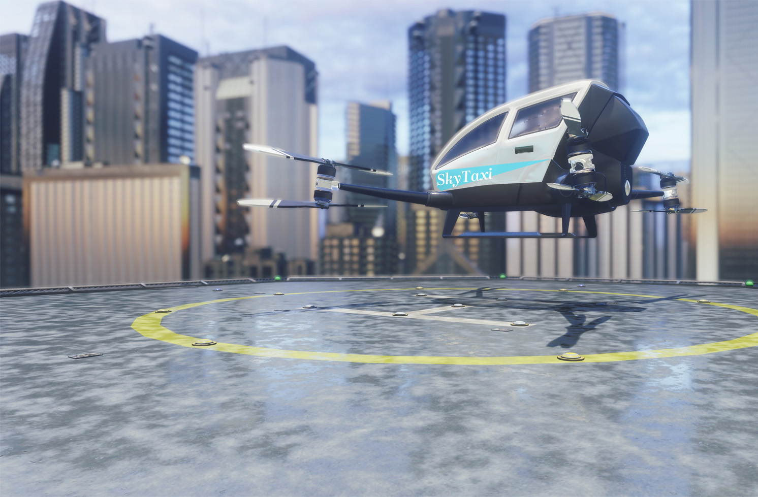eVTOLは、電動モーターで翼を回転させ、垂直離着陸できる大型のドローンのような航空機で、パイロットが搭乗せず自動操縦で飛行します。動力は電気のため環境負荷も少なく、10分充電すると50分連続飛行が可能です。機体は、大宝タクシーの車体同じく青と白のツートンカラーにし、親しみやすいデザインにいたします。導入予定の機体は現在、国内で飛行の実証実験が行われています。