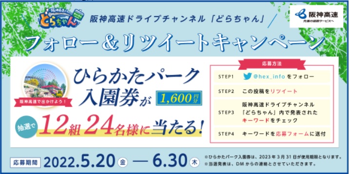 5月に公開された動画に登場する、大阪府枚方市の「ひらかたパーク」入園券が抽選で12組24名様に当たるキャンペーンです。