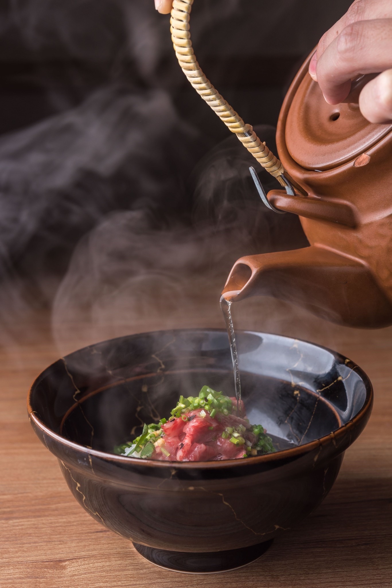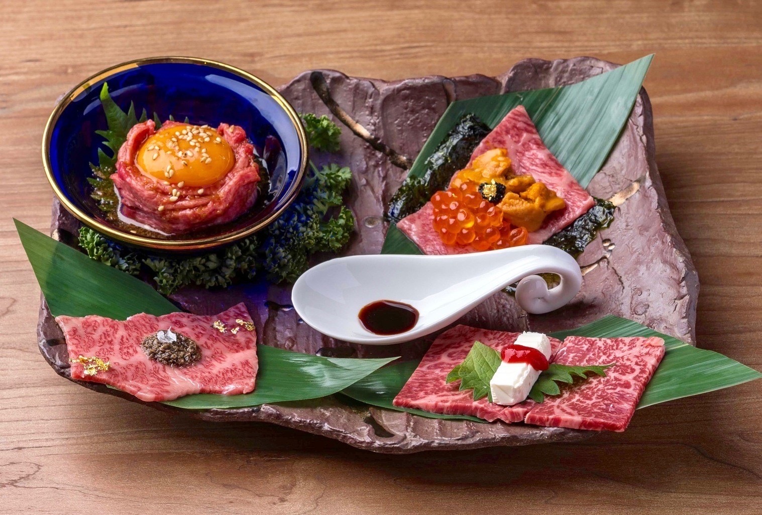 全国各地から厳選した黒毛和牛の赤身をメインに、ランプやイチボ、ラムシンなど脂身の少ない部位をご提供しています。塊で仕入れた肉を店内で捌いた鮮度のよい肉には、濃いタレは必要ありません。肉本来の旨味を味わっていただくため、塩やわさび、甘酢玉ねぎ、大根おろしのほか、肉の余分な脂を落とす「洗いダレ」をご用意しております。コースは懐石料理のように、先付の前菜から始まり、向付の「タンのユッケ」や椀物の「和牛と大根の白味噌煮」などの後に、焼肉をご提供します。最後は、鰹と昆布でとった出汁茶漬けで、あっさりと〆ていただきます。和食出身の料理人が、胃もたれしないようにコース料理を考案しました。