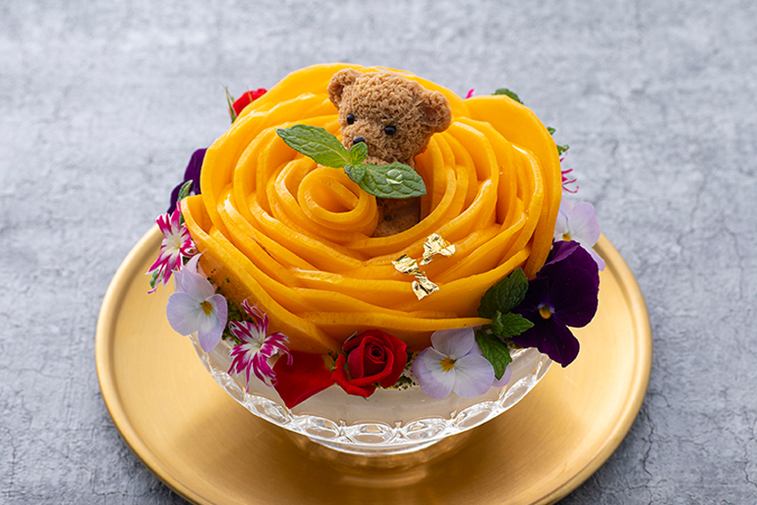 花に見立てたブーケのようなマンゴーに埋もれたくまチョコや、さくらんぼを持った