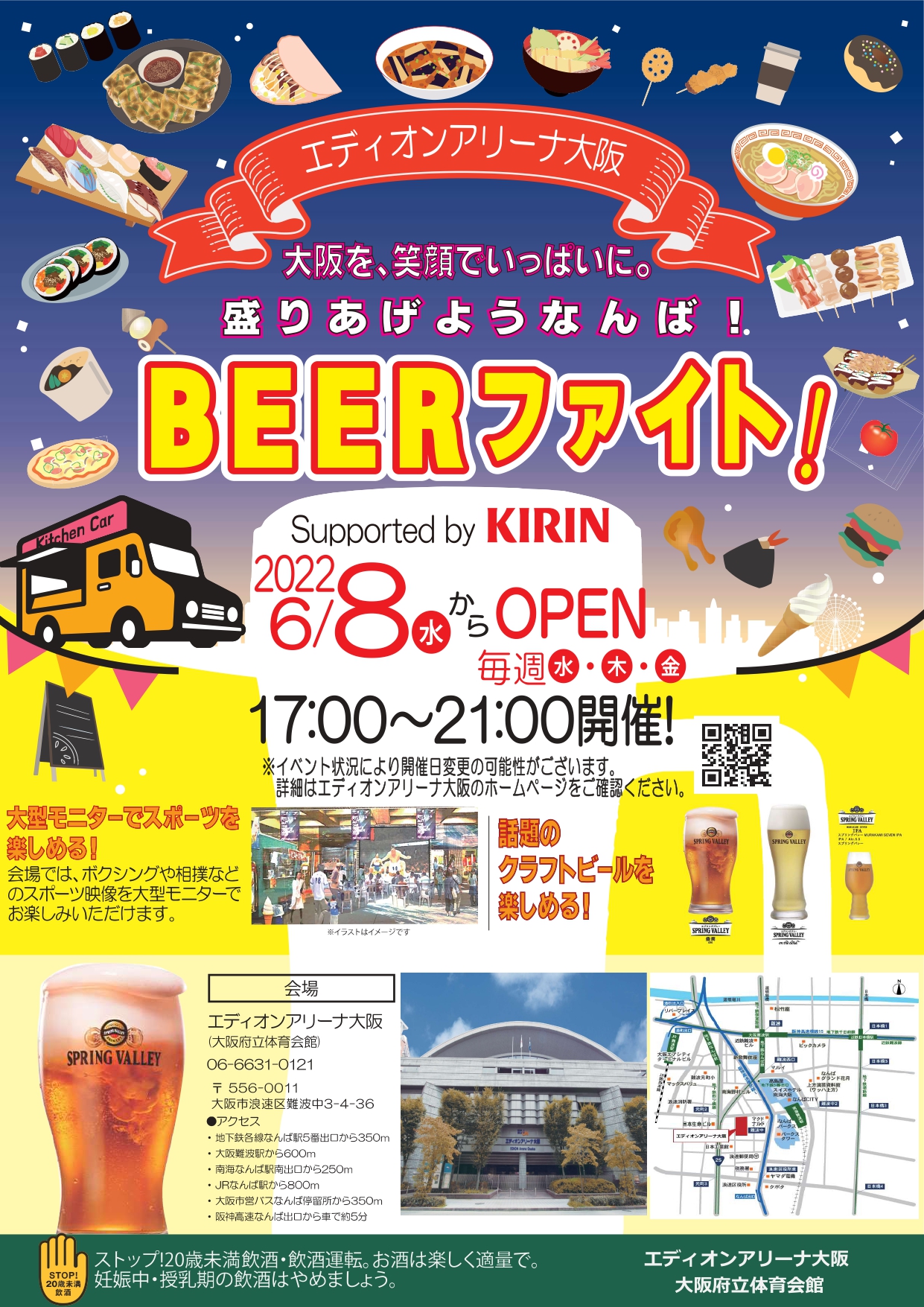 大阪府立体育会館(大阪市浪速区難波中3-4-36)では、6月8日から11月末までの毎週水・木・金を中心に、キッチンカーが集まったビアガーデン「BEERファイト」を開催します。毎回最大6店舗が出店し、期間中のべ100店舗のキッチンカーが出店します。