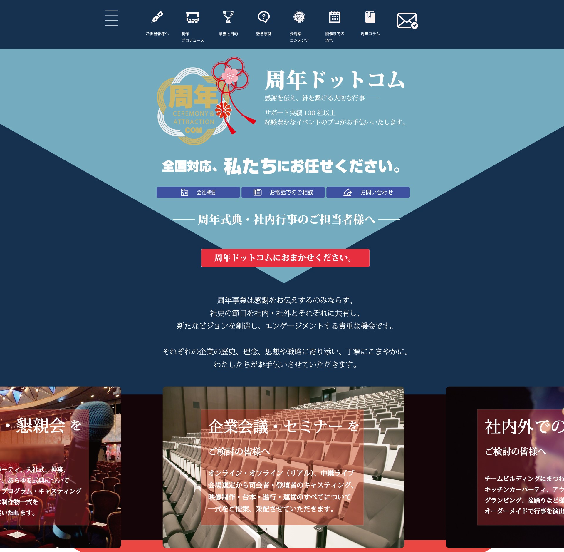「周年ドットコム」 … 企業の節目にまつわる記念式典・懇親会パーティ。施設落成式・社内運動会・地域交流イベント。ホテル新年会・忘年会から大規模周年事業、展示会や中継会議など、地域と会社・企業のあらゆる行事を総合的に対応いたします。実績100社以上、経験豊かなスタッフがご担当者様の疑問に寄り添って支えます。