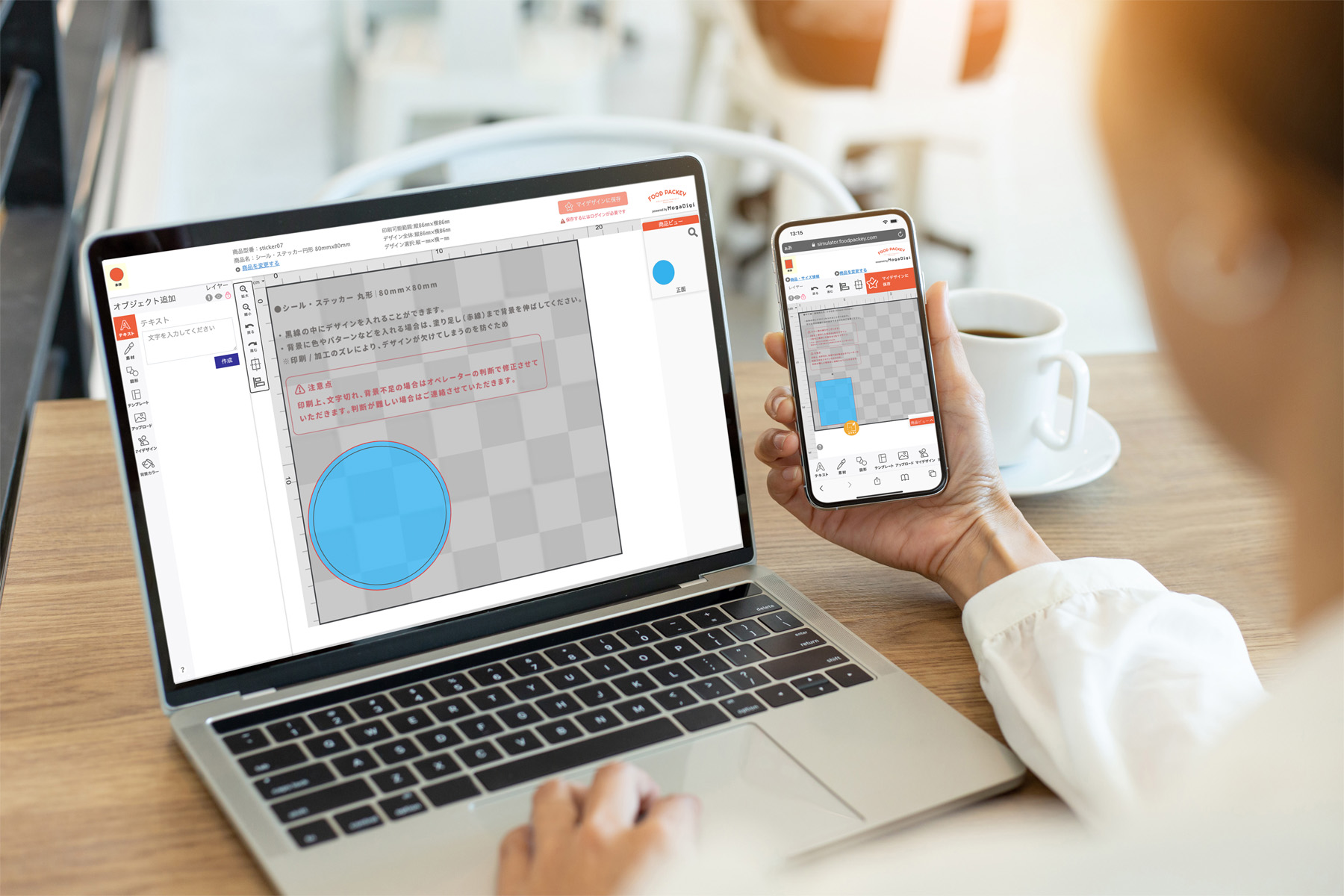 店舗のロゴがあれば、専門ソフト不要でスマホからオリジナルのシールや包装紙、紙袋を注文できます。「デザインシミュレーター」にロゴをアップロードし、スタンプや文字、カラー指定、サイズ変換などの操作をして、カンタンにオリジナルデザインをつくれます。印刷やデザインの専門知識の必要は無く、デザイナーに支払う費用も節約できます。また、一般的な通販型印刷会社は入稿データに不備があった場合、修正して再入稿する必要がありますが、「FOOD PACKEY」では、プロのデザイナーが微調整や修正を行うため、再入稿の必要がありません。