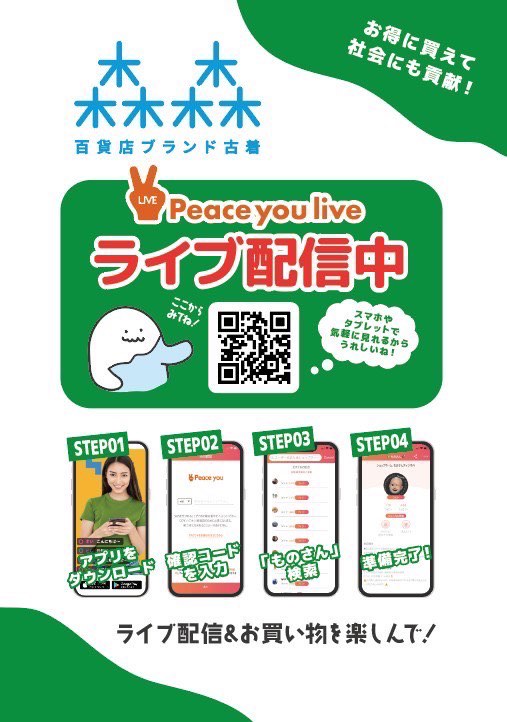 当社が運営する「森森(MORI MORI)」は、日本唯一のオークションが楽しめるライブコマースサービス「ピースユーライブ」内でライブ配信販売を行っています。「ヒステリックグラマー」や「ラルフローレン」なのどブランド古着を取り扱い、メンズ・レディース・キッズと幅広い層をラインナップ。分かりやすく手に取りやすい価格設定で営業しています。今回初の試みとなるポップアップショップでは、メンズ・レディース・キッズ約1,000着の洋服を取り揃えますが、平日はライブコマース専用スタジオとして利用。土曜・日曜のみ店頭販売するという次世代型の営業スタイルに挑戦します。