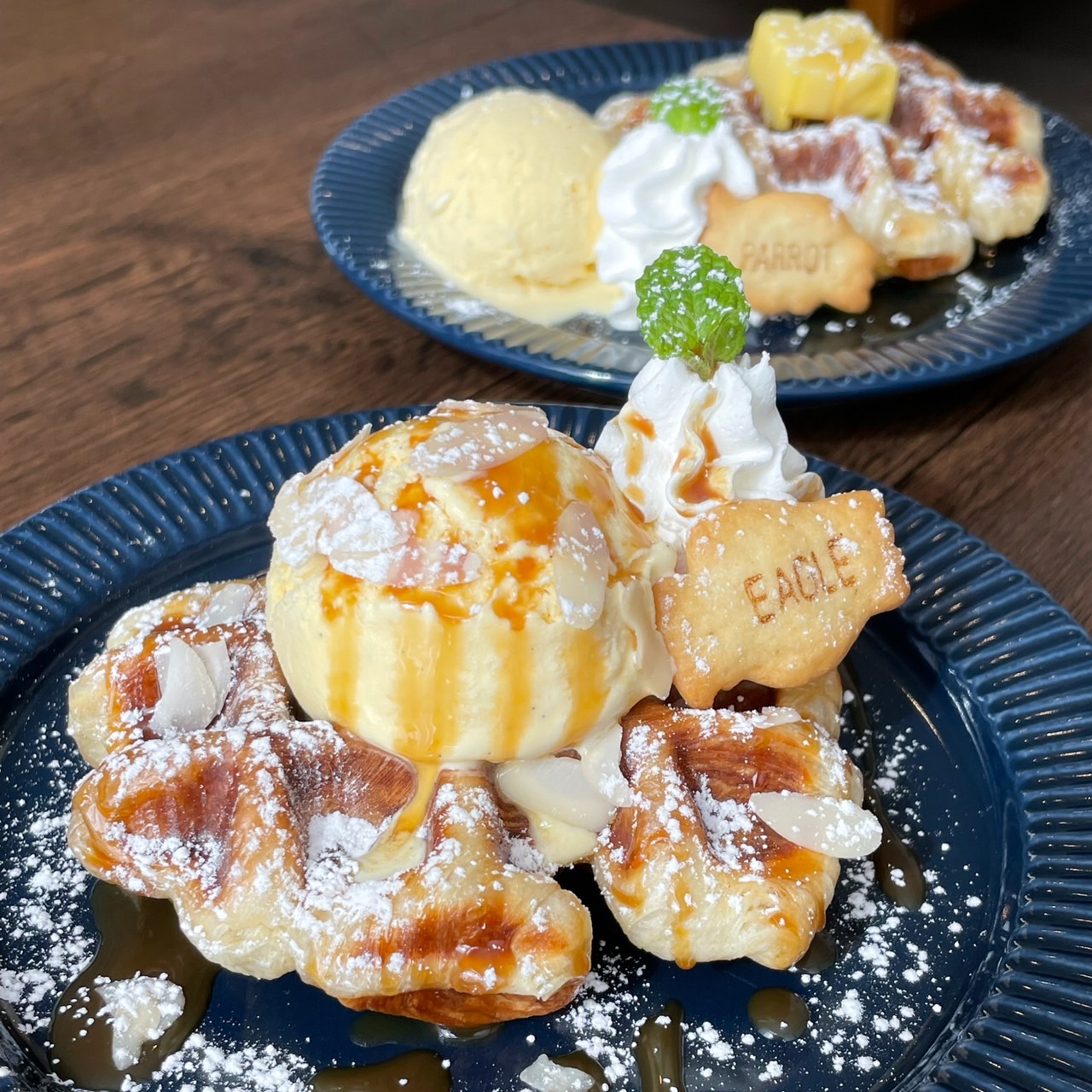 メイプルバター・キャラメルアーモンド・チョコレート・ミックスベリー・抹茶・黒蜜きな粉の6種類のトッピングから選べる焼きたてクロッフル&ワッフルのほか、濃厚でしっとりとした生ガトーショコラとチーズケーキなどを提供。