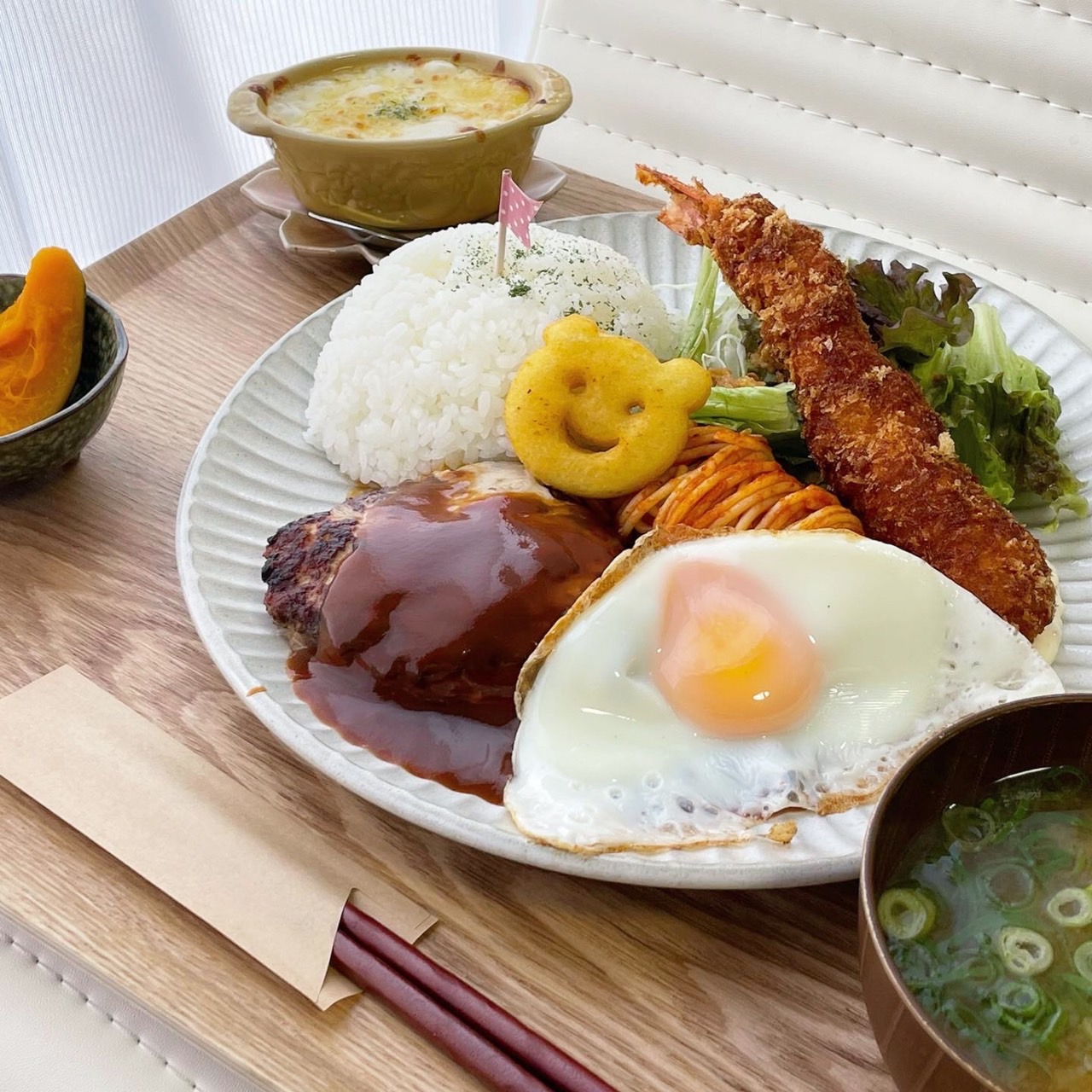 圧倒的人気メニューはお客様の要望から誕生した「大人様ランチ1,200円」!ジューシーハンバーグ・大きなエビフライ・ナポリタン・目玉焼き・くまさんポテト・ミニグラタン・日替わり一品・サラダ・ご飯・味噌汁・漬物・ミニデザートがセットになったボリューム満点の内容です。