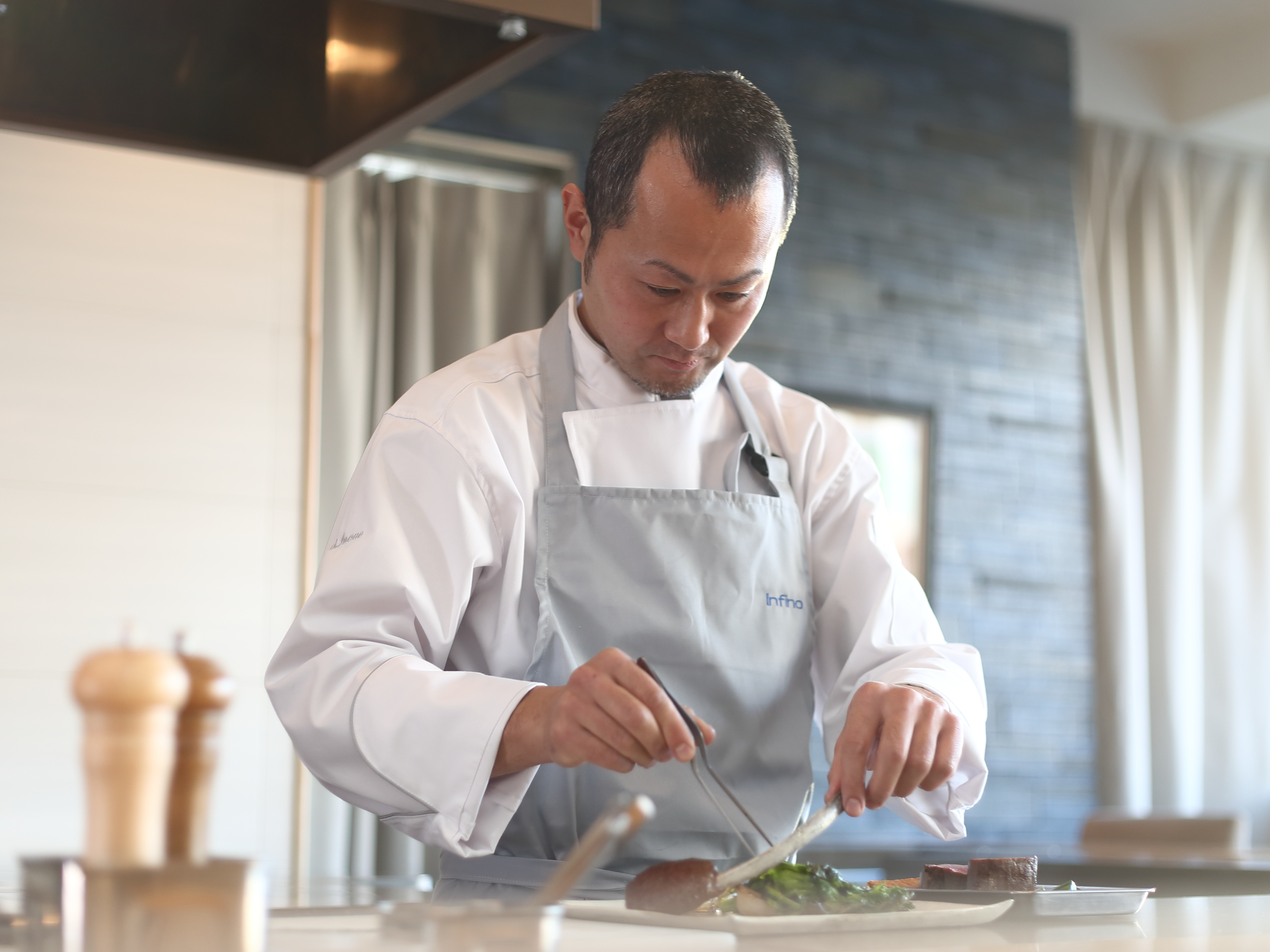 【演出】 明治時代に生まれた大阪発祥の食文化スタイルである“カウンター割烹”の要素を取り入れ た“カウンターフレンチ×メイドインジャパン”に遊び心、楽しませる気持ちを大切に料理の 仕上げなどをお客様の目の前で行うプレゼンテーションなどカウンターだから生まれる独 特のライブ感にストーリーを乗せて提供する料理をはじめとした食空間の提供で五感を刺 激し、さらに感動を生み出す。