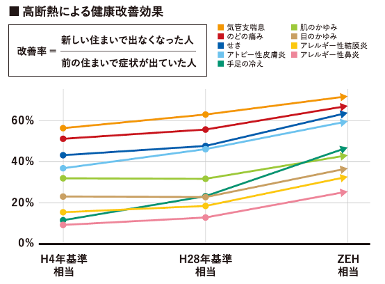 健康面では、断熱等級と言えば、寒冷地での仕様と考えられているケースが多いが、実は暖かいエリアほど冬季死亡増加率が高い(※3)温暖なエリアである兵庫県で他社に先駆け断熱性能の高い家を普及させ、家族が健康的で快適に長きにわたり安心して住まうことができる住宅の建築に取り組んでいく。結果、ヒートショックなどによる介護リスクが低下し、健康寿命の延長に繋がる。突然のヒートショックだけでなく、高断熱による適正室温維持はアレルギー性鼻炎やアトピー、気管支ぜんそくの症状を和らげることが大学の研究でも明らかになっている(出典 近畿大学 建築学部 岩前研究室 高断熱による健康改善効果 ※4)