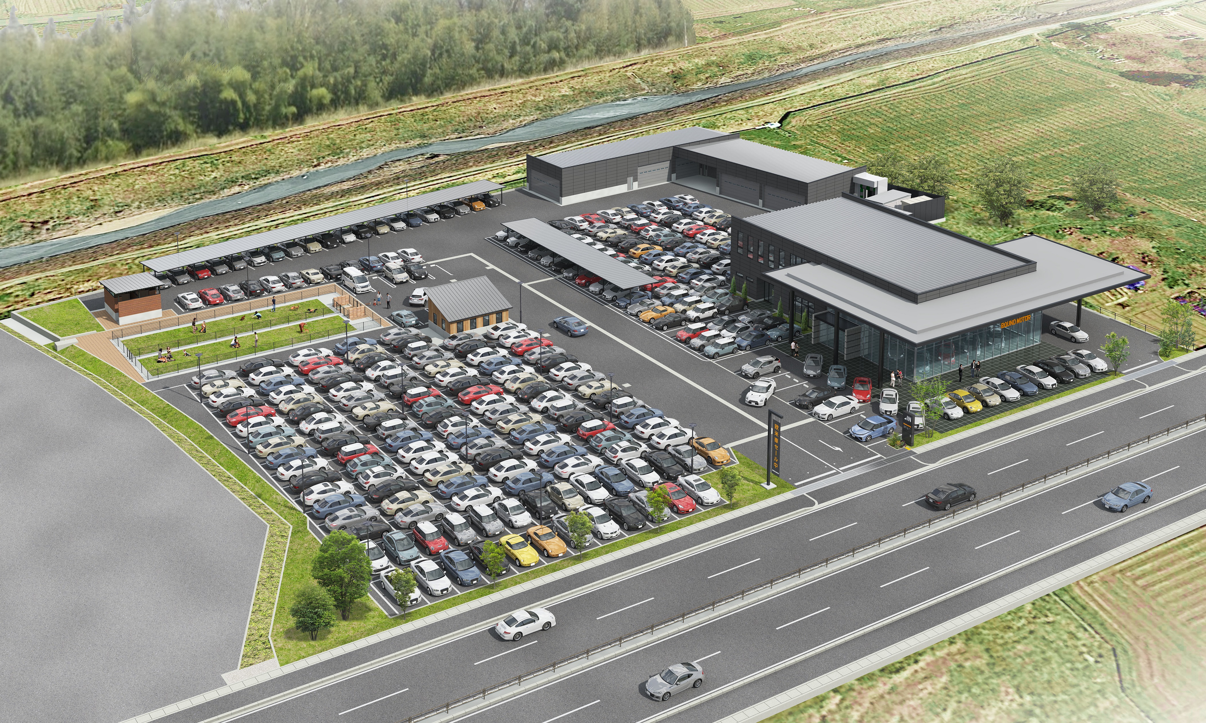 施設構成:カフェ、ドッグラン、展示スペース(常時150台)、整備スペース、レンタカースペース