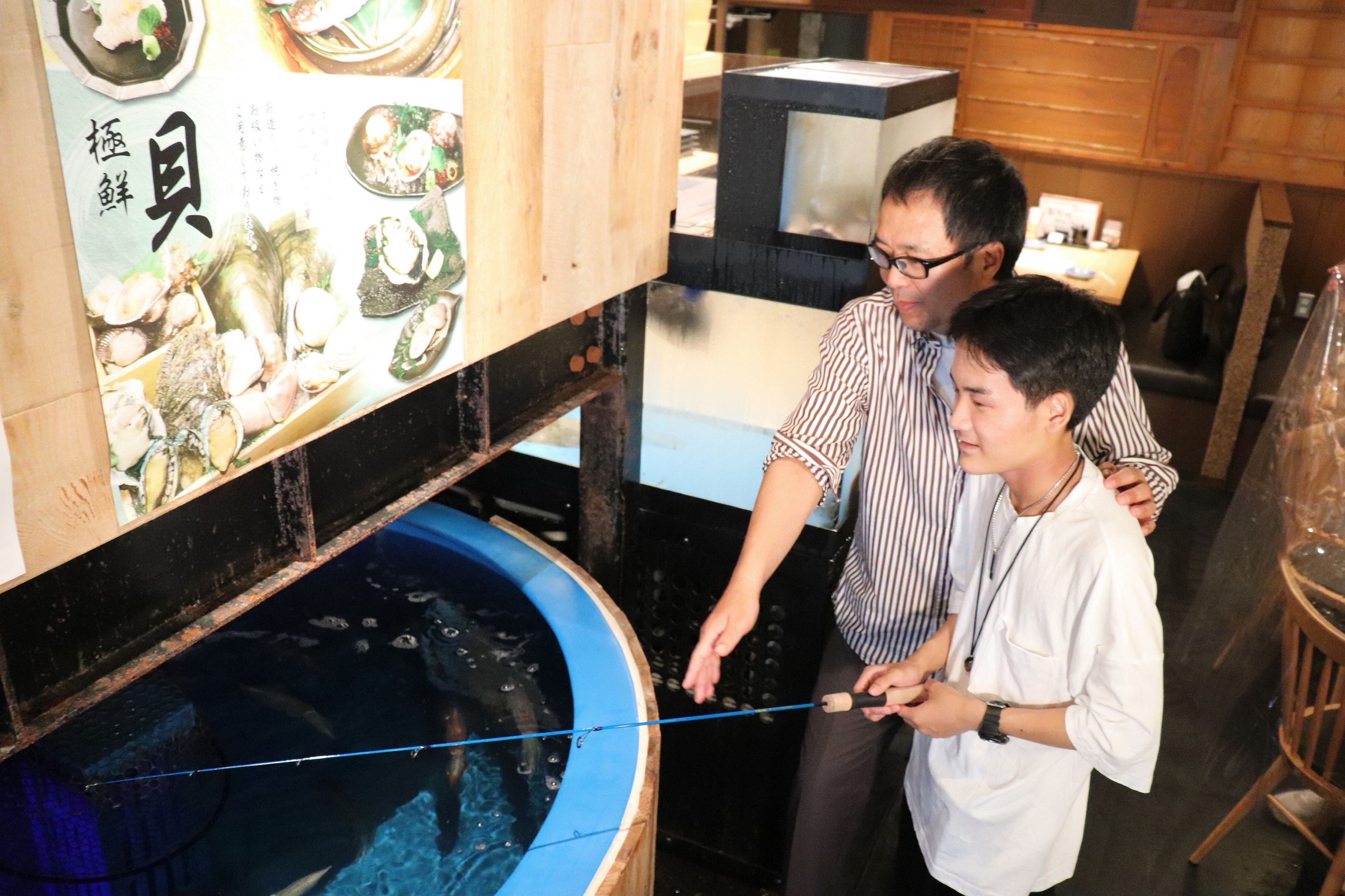 高知県出身で10歳から釣りを始め、現在も月4回は船に乗って釣りをする当社代表の明坂が、釣りの楽しさを気軽に知ってほしいと夏休み期間に小・中学生を対象とした「リアルイカゲーム」(3,000円)を企画。釣り竿を使って水槽で泳ぐイカを1杯釣っていただき、お造りにしてご提供します。イカは、夏が旬で甘みが強い剣先イカをご用意。切り方は、薄くそぎ切りする「そぎ造り」と細く切る「細造り」から選んでいただき、刺身に向かないゲソやミミの部分は天ぷらか塩焼きで調理いたします。