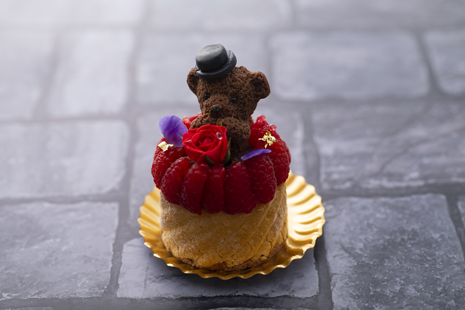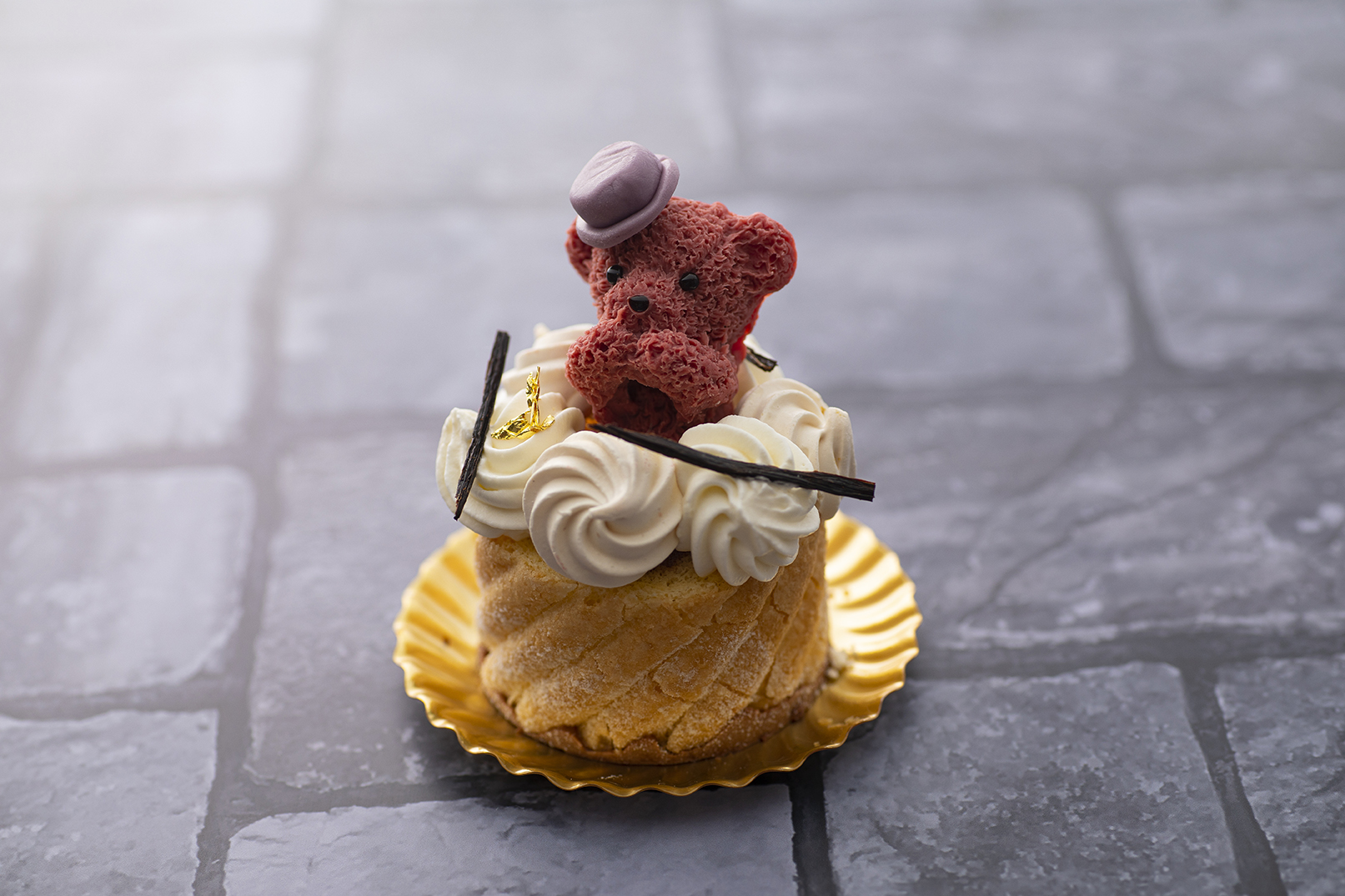 ムースのまわりをビスキュイ生地で囲んだ、帽子をイメージしたケーキにくまチョコがおすわり♪