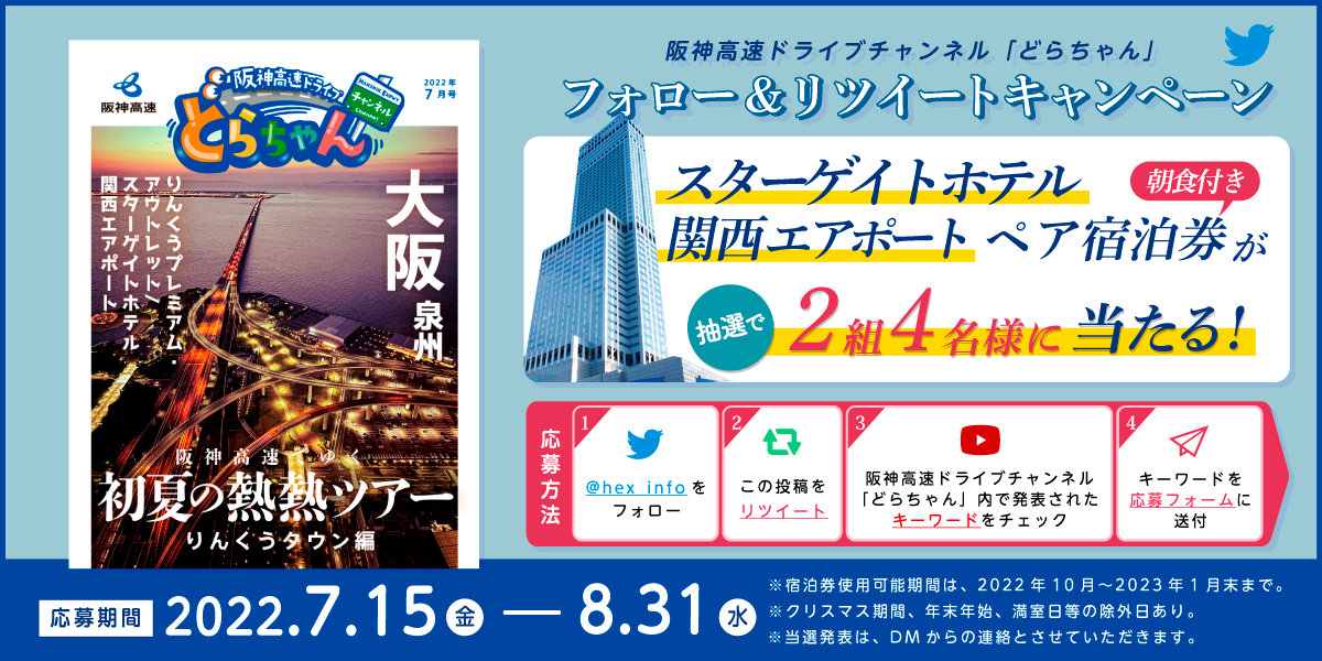 応募方法は阪神高速のTwitterアカウントをフォローし、キャンペーンツイートをリツイート。そしてYouTube動画内で発表されるキーワードを応募フォームにて送っていただきます。是非ご応募ください。