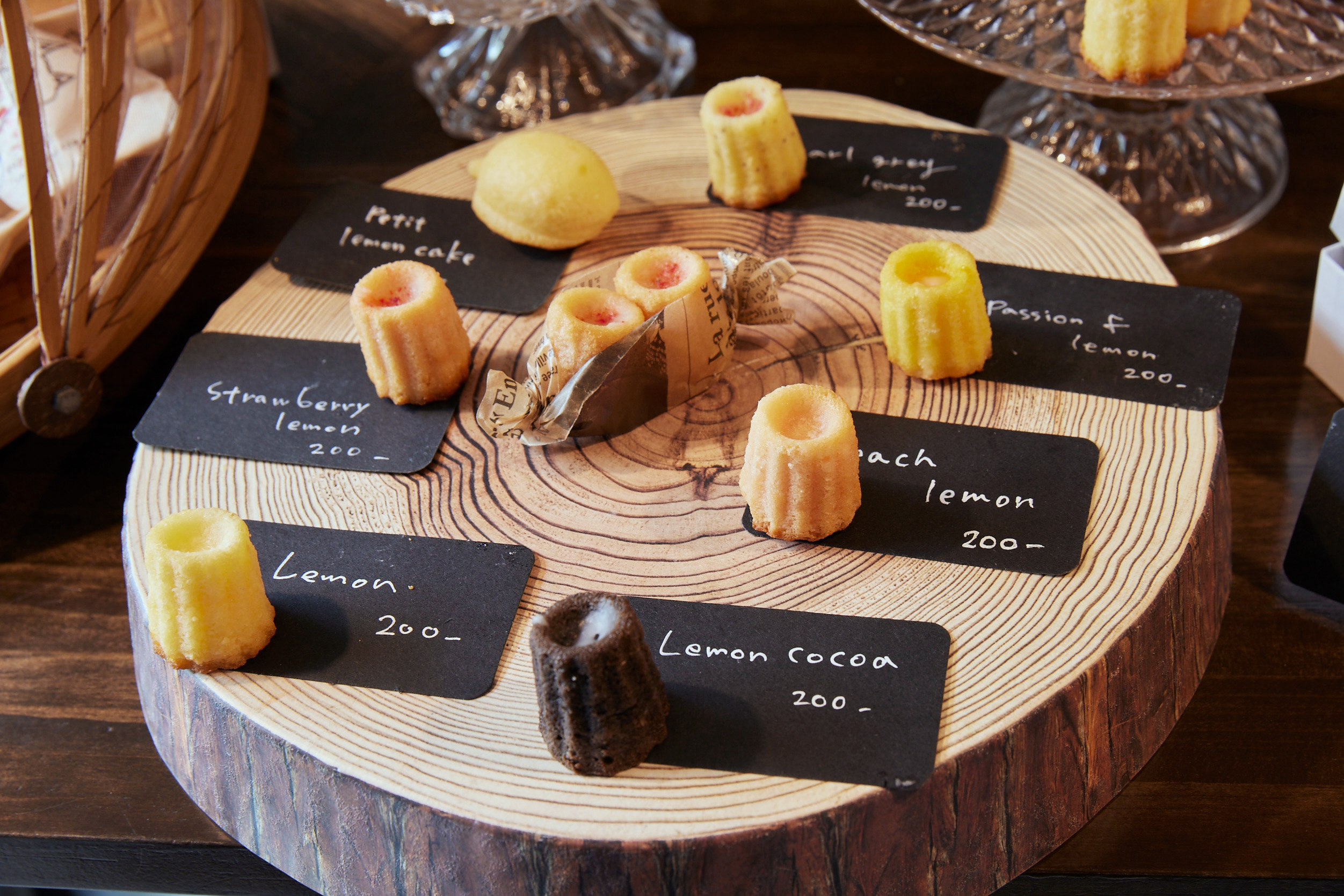 レモンケーキはレモン型とカヌレ型の2種類で、それぞれ「petit(プティット)」 「grande(グランデ)」の大小2サイズをご用意。フレーバーはノーマルのレモンのほか、カヌレ型はアールグレイや、ココア、パッションフルーツ、イチゴなど常時6種類をそろえています。どちらの形も同じ生地を使っていますが、カヌレ型は生地がしっかり焼き上がるため香ばしさと食感が加わります。四ツ橋店限定で、「四ツ橋レモンチーズタルト」もご用意しております。