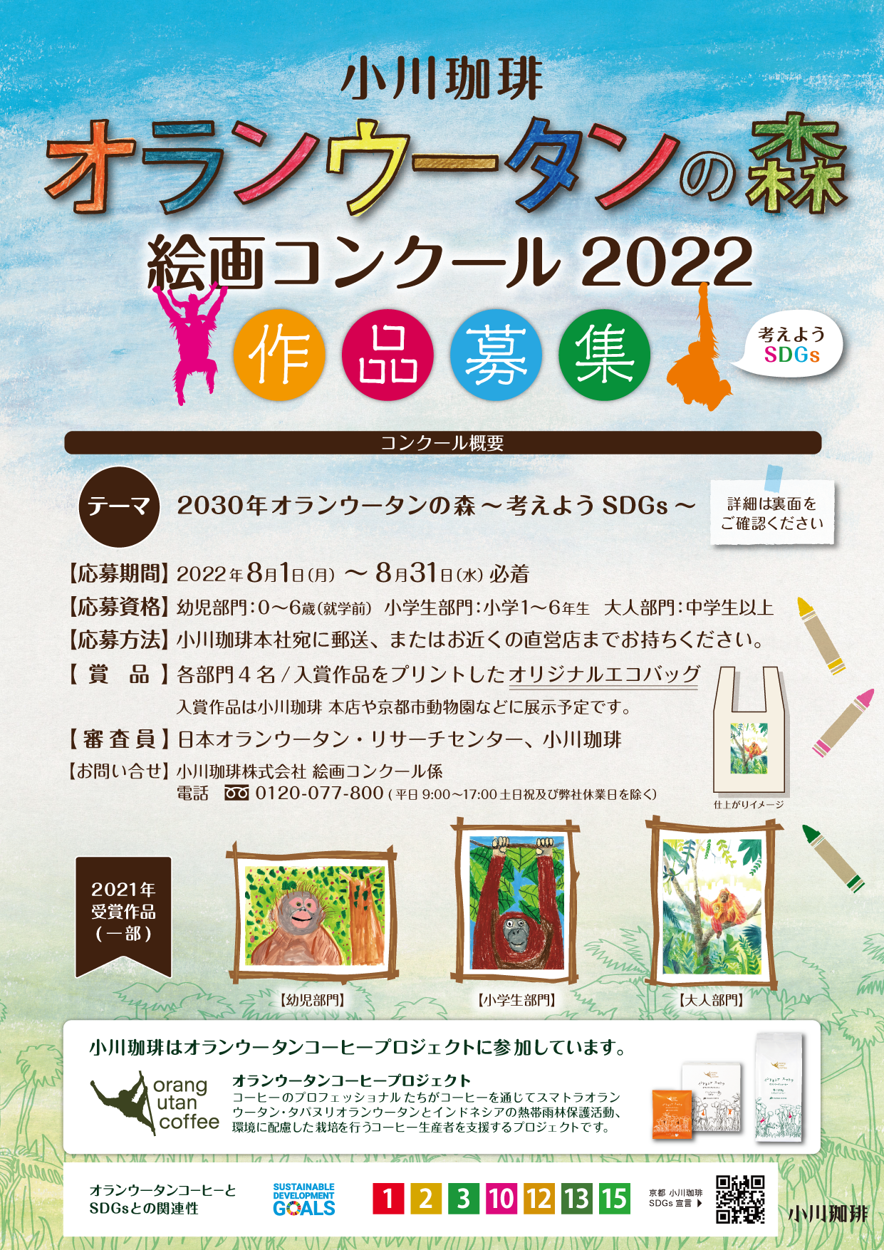 コンクール名:小川珈琲 オランウータンの森 絵画コンクール2022応募期間:2022年8月1日(月)~8月31日(水)必着絵画テーマ:2030 年オランウータンの森 ~考えようSDGs~