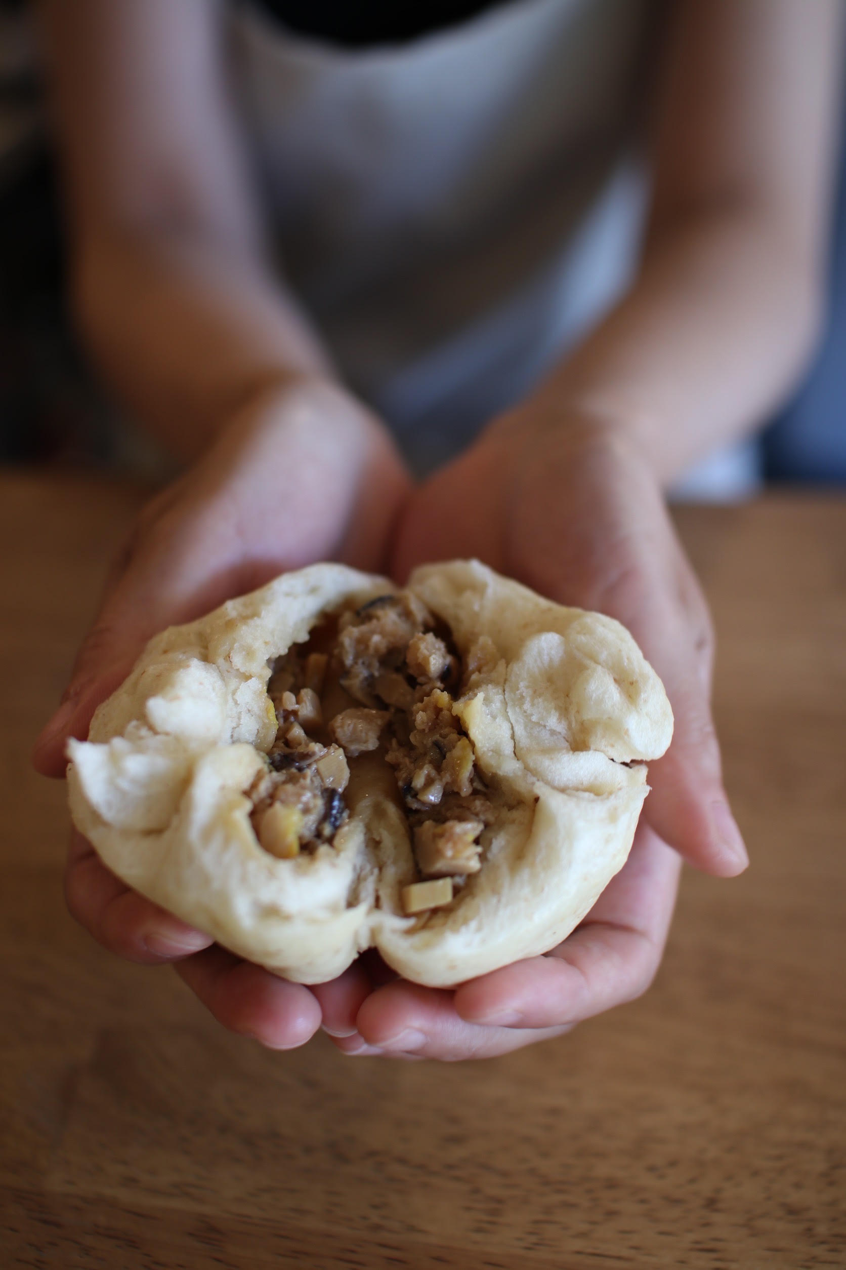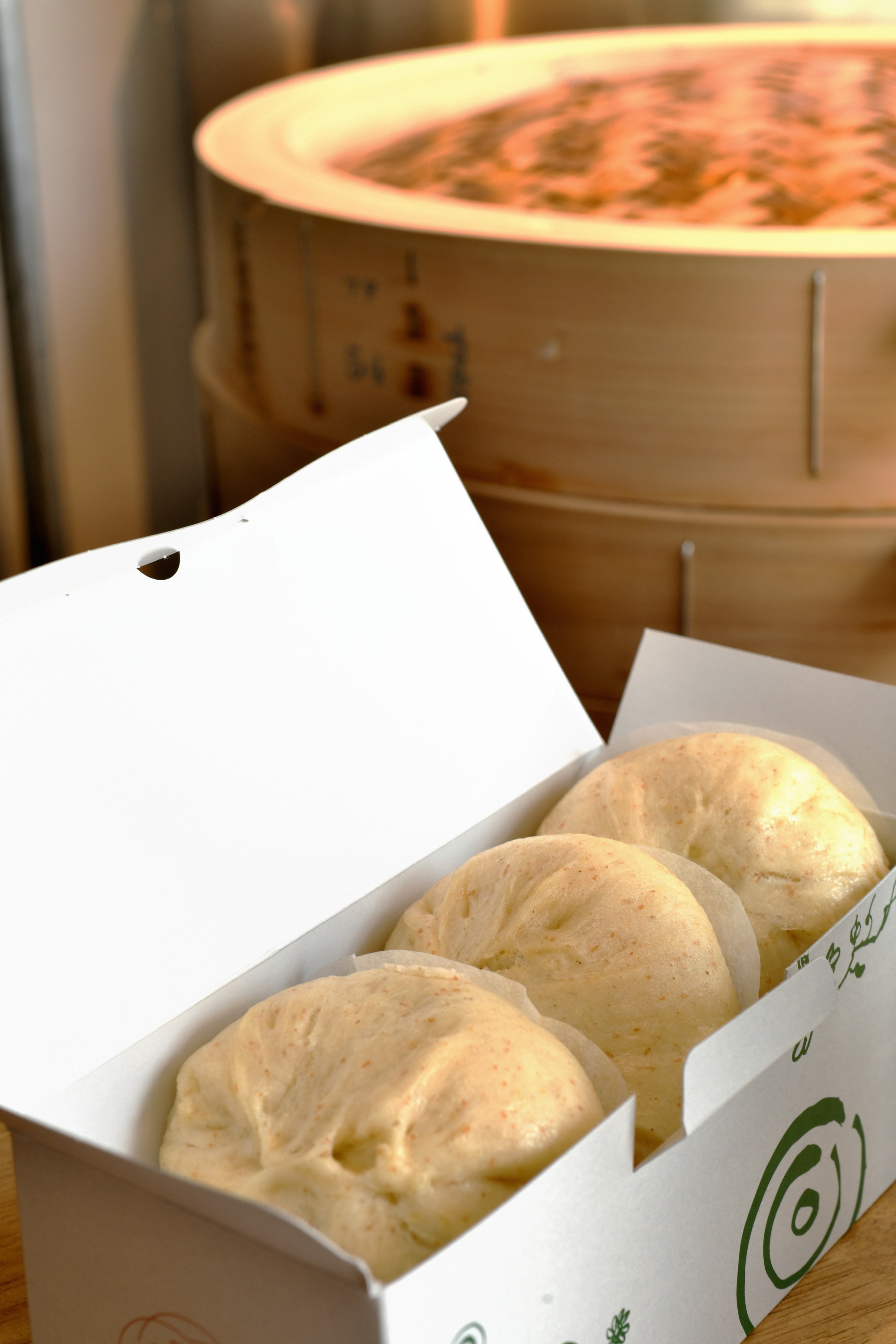フードメニューは、肉の食感が残るよう少し粗めに切った希少な「長崎芳寿豚」と白菜、生姜、筍、干し椎茸など国産の野菜を使った肉まん「肉包子(にくぱおず)」(300円)、北海道産小豆で作る自家製の黒胡麻餡に蒸したさつまいもを入れたあんまん「黒胡麻餡とさつまいも包子」(300円)、 スパイスカレー風味の長崎芳寿豚の角煮を熱々の皮ではさんだ「豚バラカレーバーンズ」(600円)の3種類。皮は、国産全粒粉と強力粉、薄力粉を独自で配合し、モチモチ食感と歯切れの良さを両立させました。