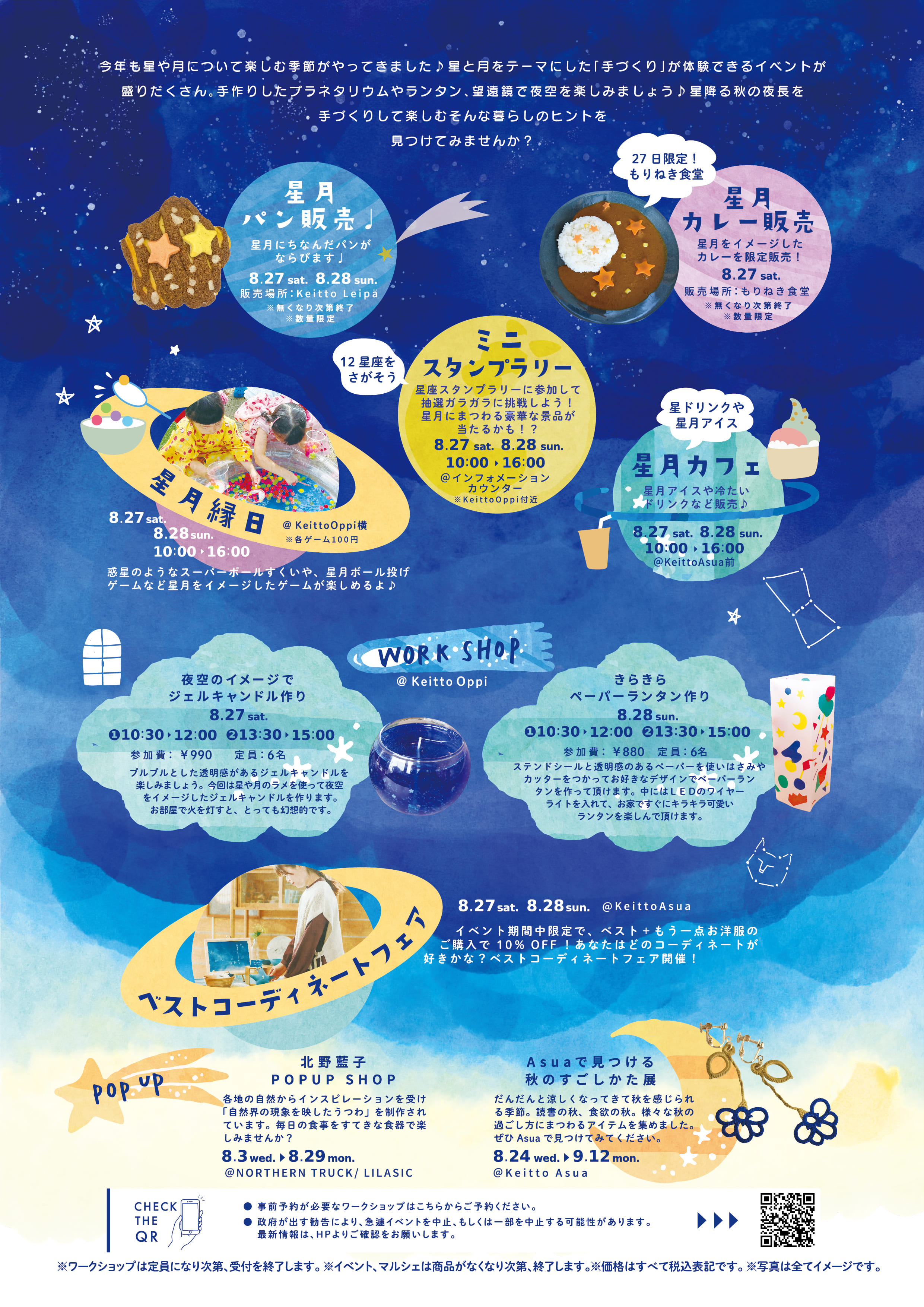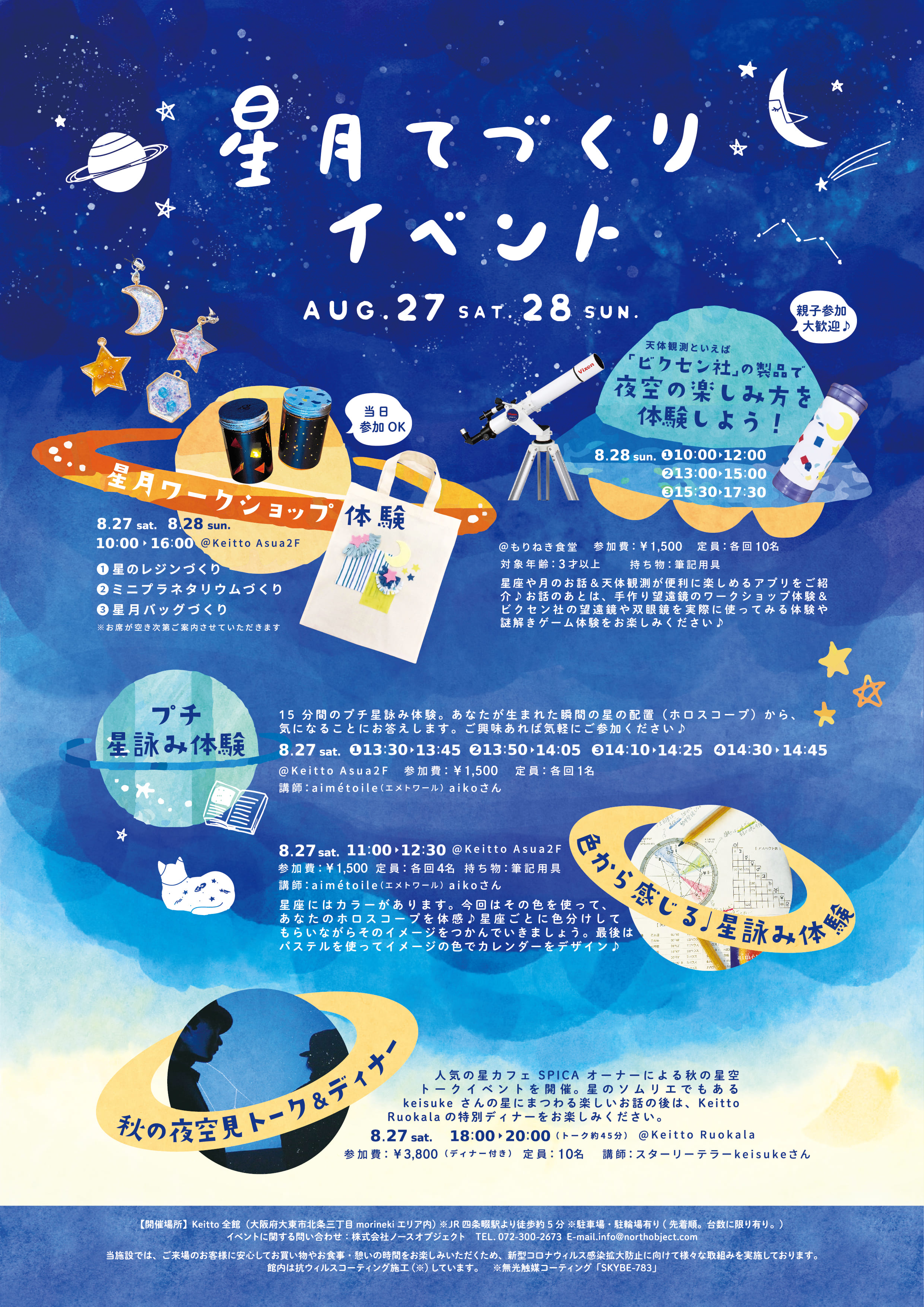 ミニプラネタリウムづくりなどの星にまつわるワークショップや、秋の夜空見トーク&ディナー、星詠み体験など、星と月をテーマにした「手づくり」が体験できるイベントが盛りだくさん。Keittoで夜空を楽しみ、夏休み最後の思い出をつくりませんか?