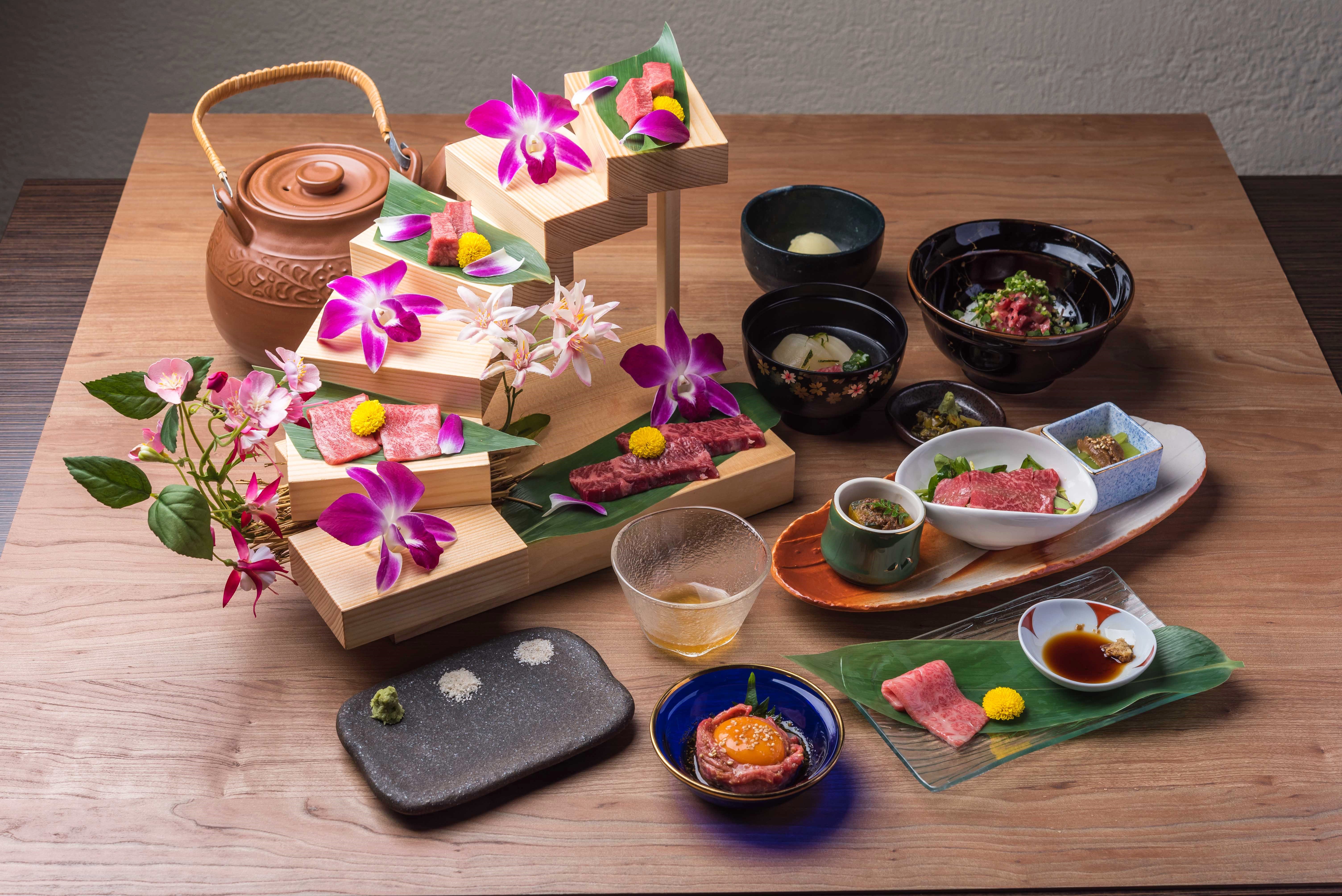前菜3種、タンユッケ、季節のお椀、甘酢玉ねぎ、本日の「花階段盛り」六種六流、