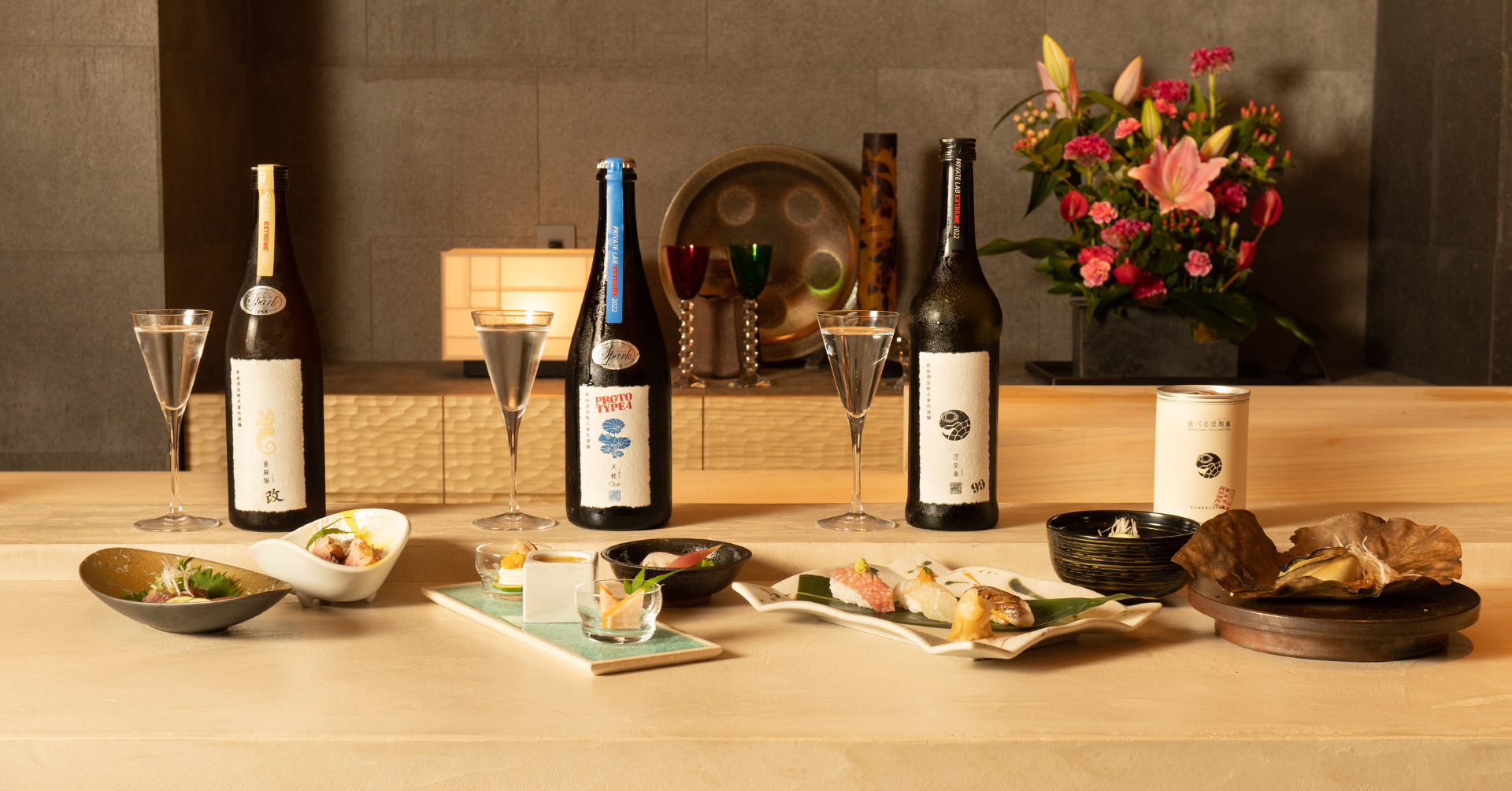 新政酒造 特別頒布会2022の限定品「PRIVATE LAB EXTREME」より「天蛙 Clear Prototype 4」「亜麻猫改スパーク」「涅槃龜 99%」「食べる涅槃龜」の4種を鮨 岩屋の逸品とお愉しみいただくペアリングコース「恵(めぐみ)」。