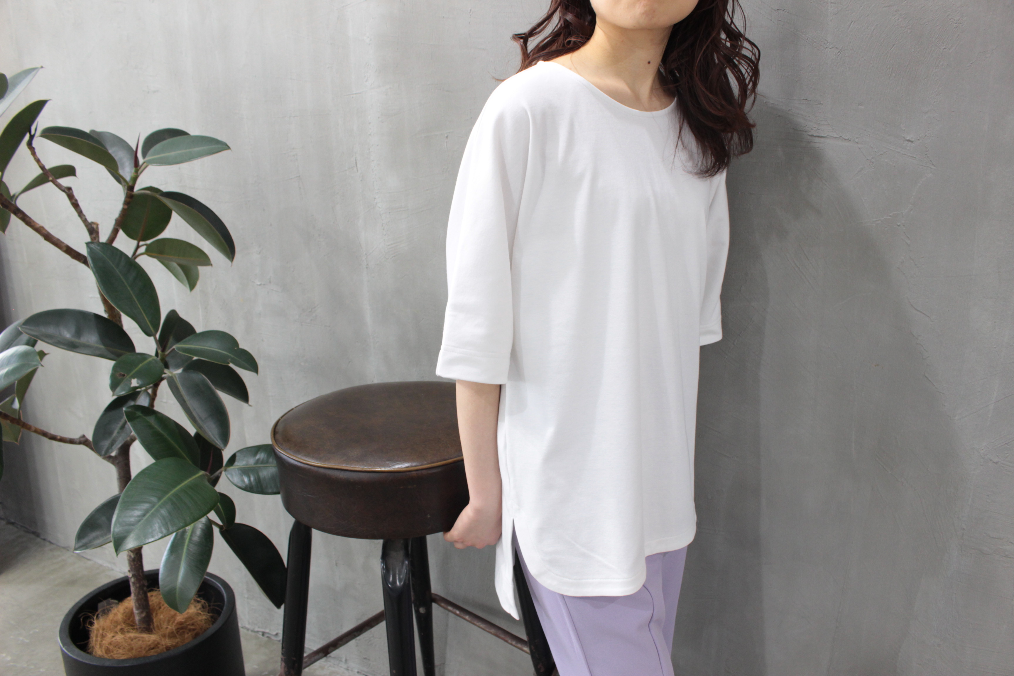 デコルテを綺麗に見せる襟のデザイン。1枚でも、重ね着でも活躍するTシャツです。巾着ポーチ付き。