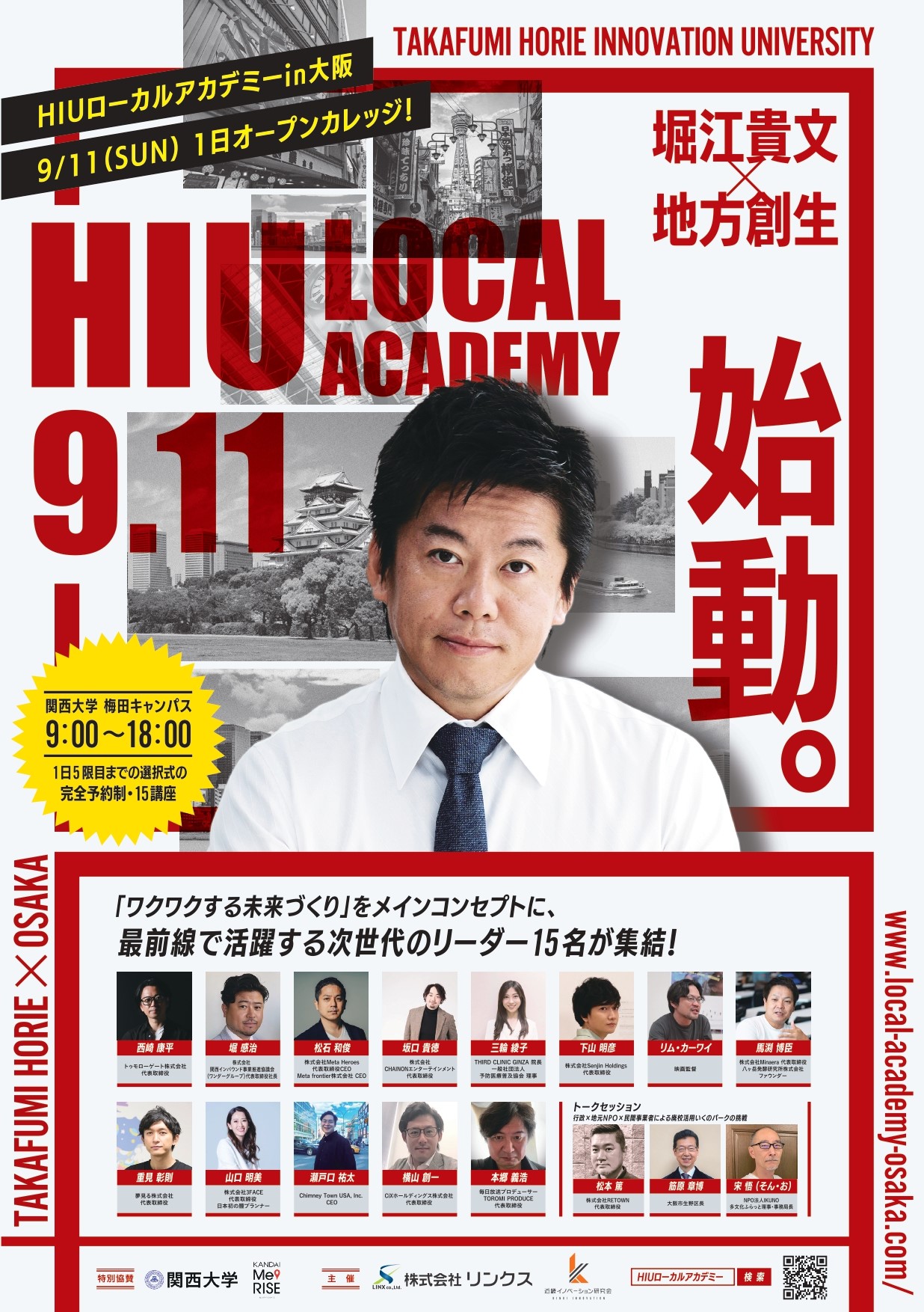 大阪駅前再開発、大阪・関西万博、IRなどの話題が続く大阪市中心部のワンルームマンションに特化した不動産投資で資産形成をサポートする株式会社リンクス(大阪府大阪市、代表取締役 毛利英昭、以下「当社」)は、当社主催で、地方創生をテーマとしたイベント「HIUローカルアカデミーin大阪」を9月11日(日)KANDAI Me RISE(関西大学 梅田キャンパス)にて開催します。現在、WEBサイトにてチケット発売中、尚、10万円のVIPチケットは即日完売。 https://www.local-academy-osaka.com