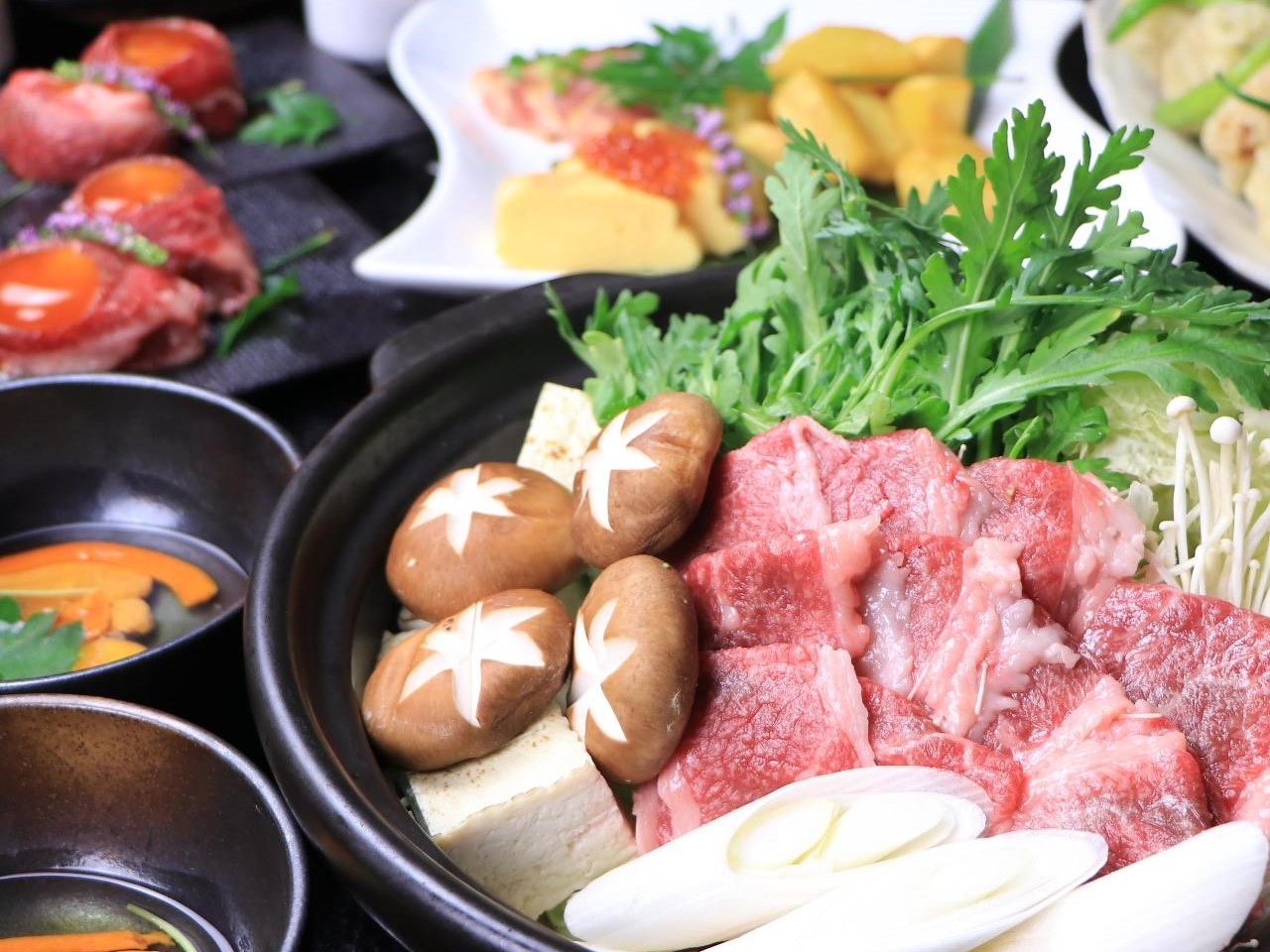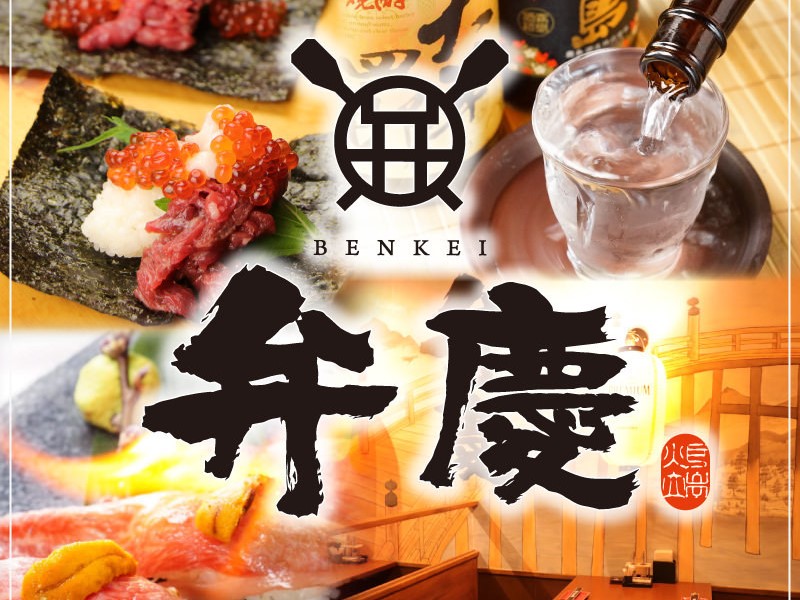 大人気のすき焼きを更に豪華に!黒毛和牛を使ったすき焼きでは、贅沢にウニと卵をからめてお楽しみ頂けます。他にも弁慶自慢の肉寿司「黒毛和牛の握り」にはトリュフを乗せ深い味わいと香りが堪りません♪最後まで満足間違いなしのコースは全10品!