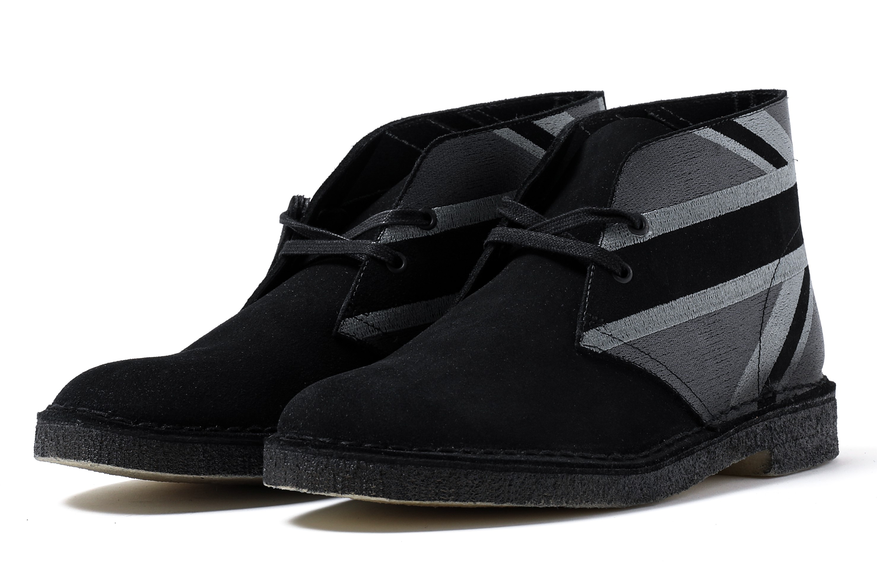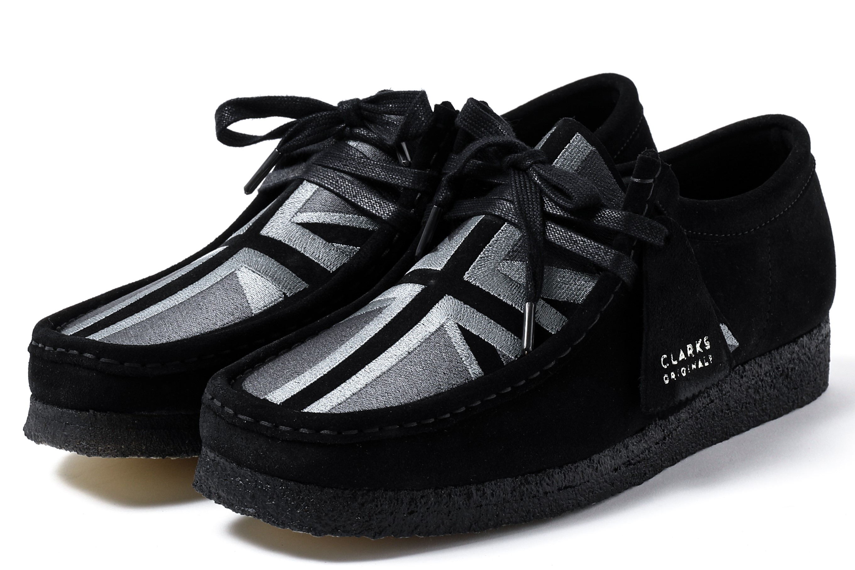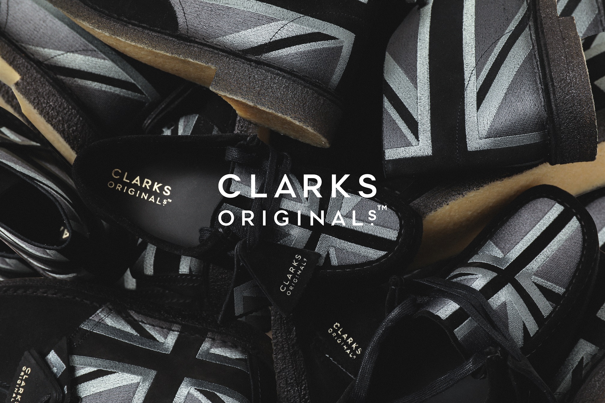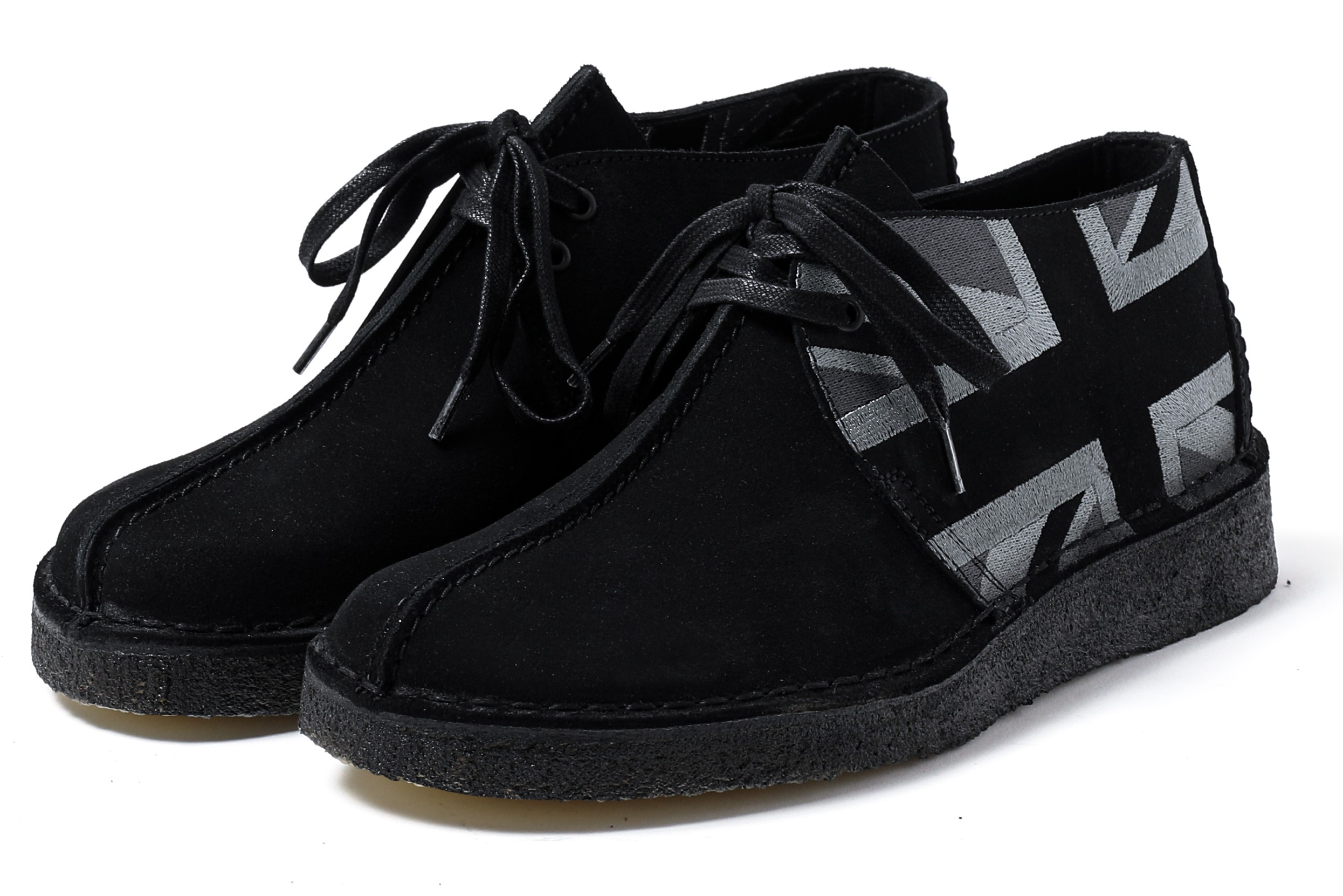 『デザート ブーツ』(8月発売予定)、『デザート トレック』(10月発売予定)、『ワラビー』(12月発売予定)のアイコニックモデルは、ブラックスエードにモノクロトーンでユニオンジャックの刺繍デザインが施されています。これは2010 年に発売されたデザートブーツ60 周年記念ユニオンジャックのモデルからインスピレーションを得てデザイン致しました。