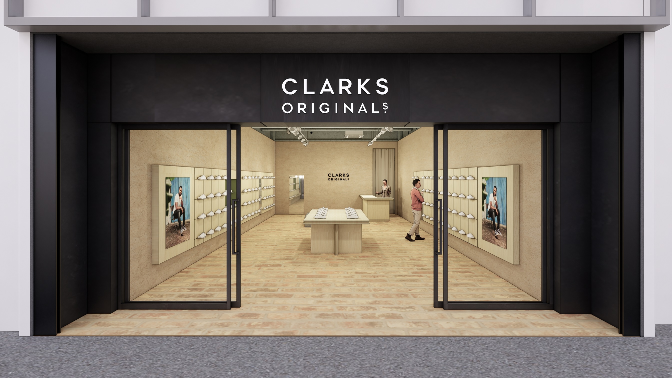 開放感のある販売スペースは、クラークスが誕生した1825年のイギリス南西部サマセット州やブランドの世界観を表現しました。