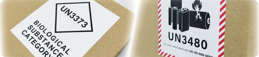 便利シール屋さん新商品【UN危険物表示シール】PCR検査の検体郵送に必要なUN3373、リチウム電池の輸送に必要なUN3481など特殊な内容物(危険物、ウイルス)の輸送・配送時に、外装箱へ表示が必要なシールを小ロット印刷します。