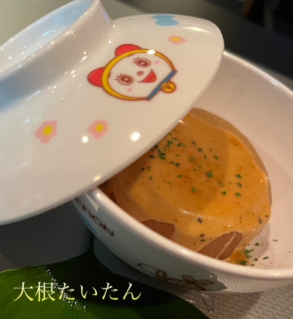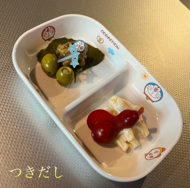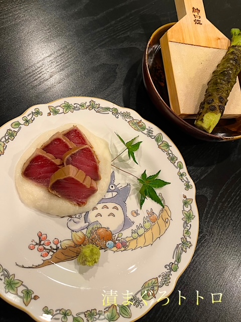 また、ペアリングも①地酒:作(ザク)や彗(シャア)にガンダムのグラスX自家製アオリイカの塩辛②地酒:三井の寿に湘北のカップX鯛の器に鯛の昆布〆③復刻版KOTOBUKIYA角瓶に北新地ハイボールグラスX干し柿バター等、器も含めたトリプルペアリングを意識しています。