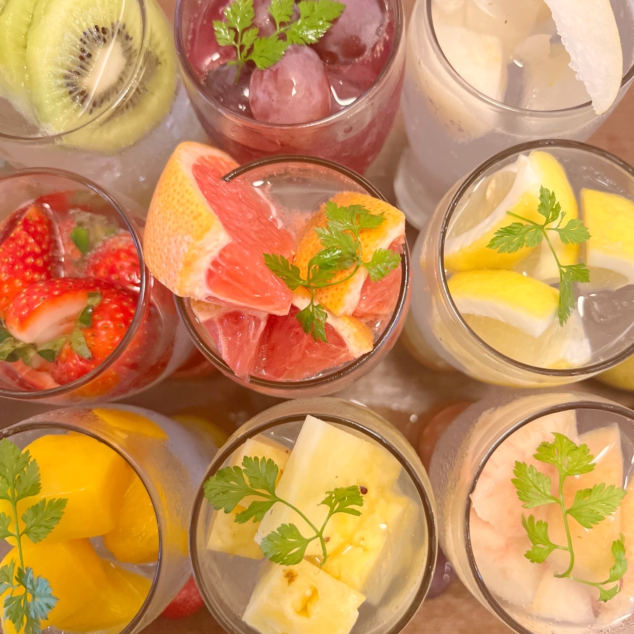 ドリンクは、生フルーツがたっぷり入った「食べるフルーツサワー」(10種、649円~)や、10種類そろえる 「進化系レモンサワー」(各種605円)、ワイン(グラス=495円~)、生ビール(605円) 、カクテル(各種539円)、日本酒(1合759円~)、アイスクリームがのった「フロートドリンク」(4種、759円)、ソフトドリンク(319円~)など約100種類をそろえています。