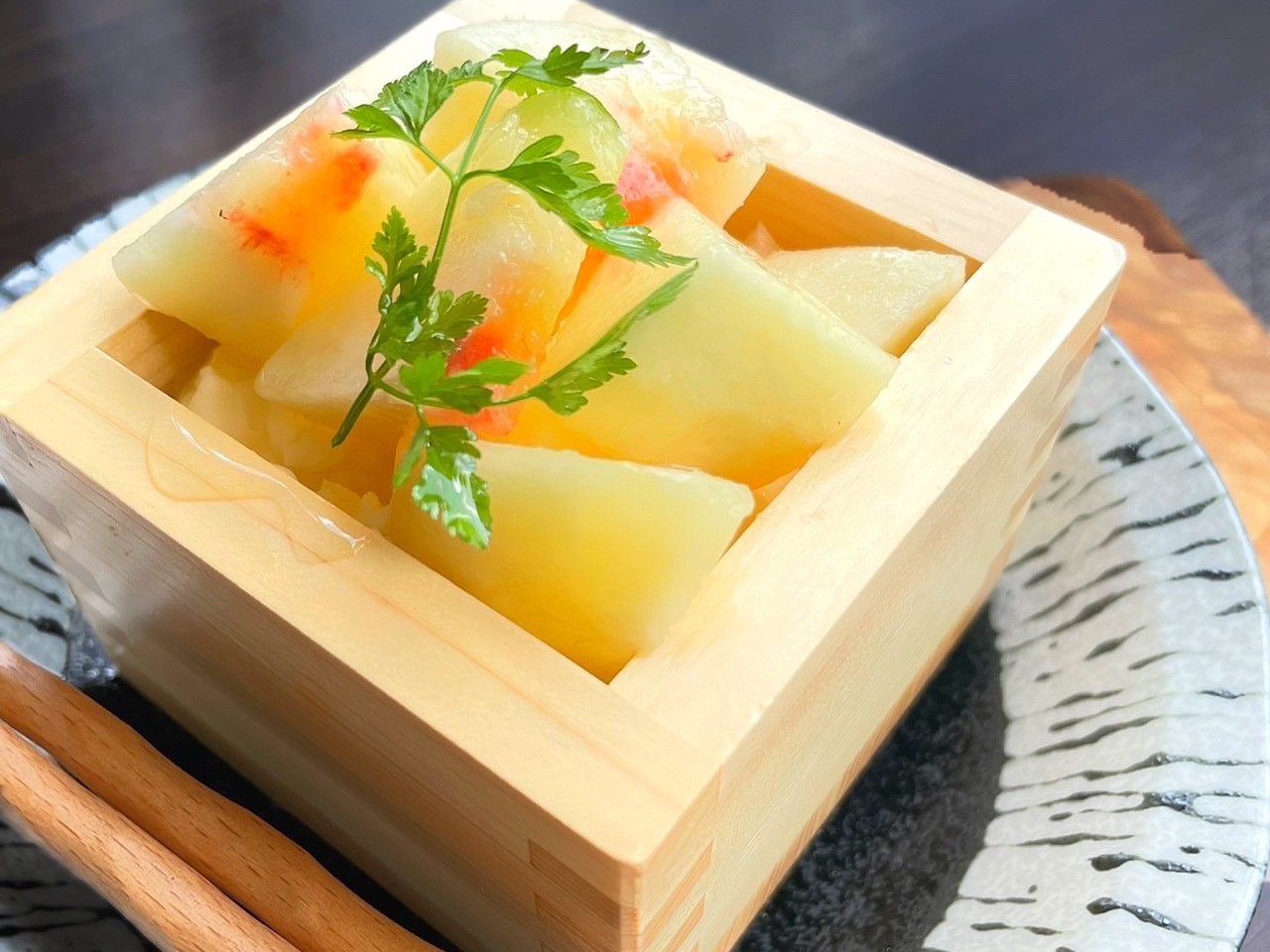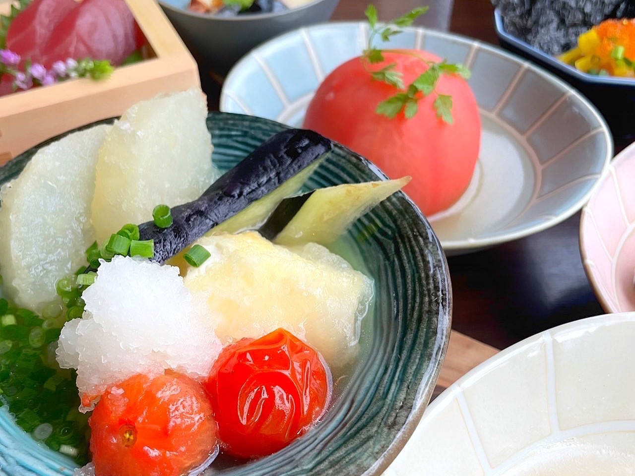 そのほか、フルーツとチーズを合わせた「季節フル~ツ枡カルポーネ」(759円)、ブラータ―チーズを1個丸々使ったカプレーゼ(1,320円)などの映えメニューから、だしがしみた「自家製京風おでん」(209円~)、「若鶏の一口唐揚げ」(2種、495円)、「だし巻き」(3種、462円)などの居酒屋の定番まで和食の職人が手作りする料理を約60種類をそろえています。土・日・祝日限定で、ワンプレートに盛り付けた熟成魚や手作りおばんざいに精米したての滋賀県産コシヒカリのご飯が付いたランチ(1,650円)もご提供。