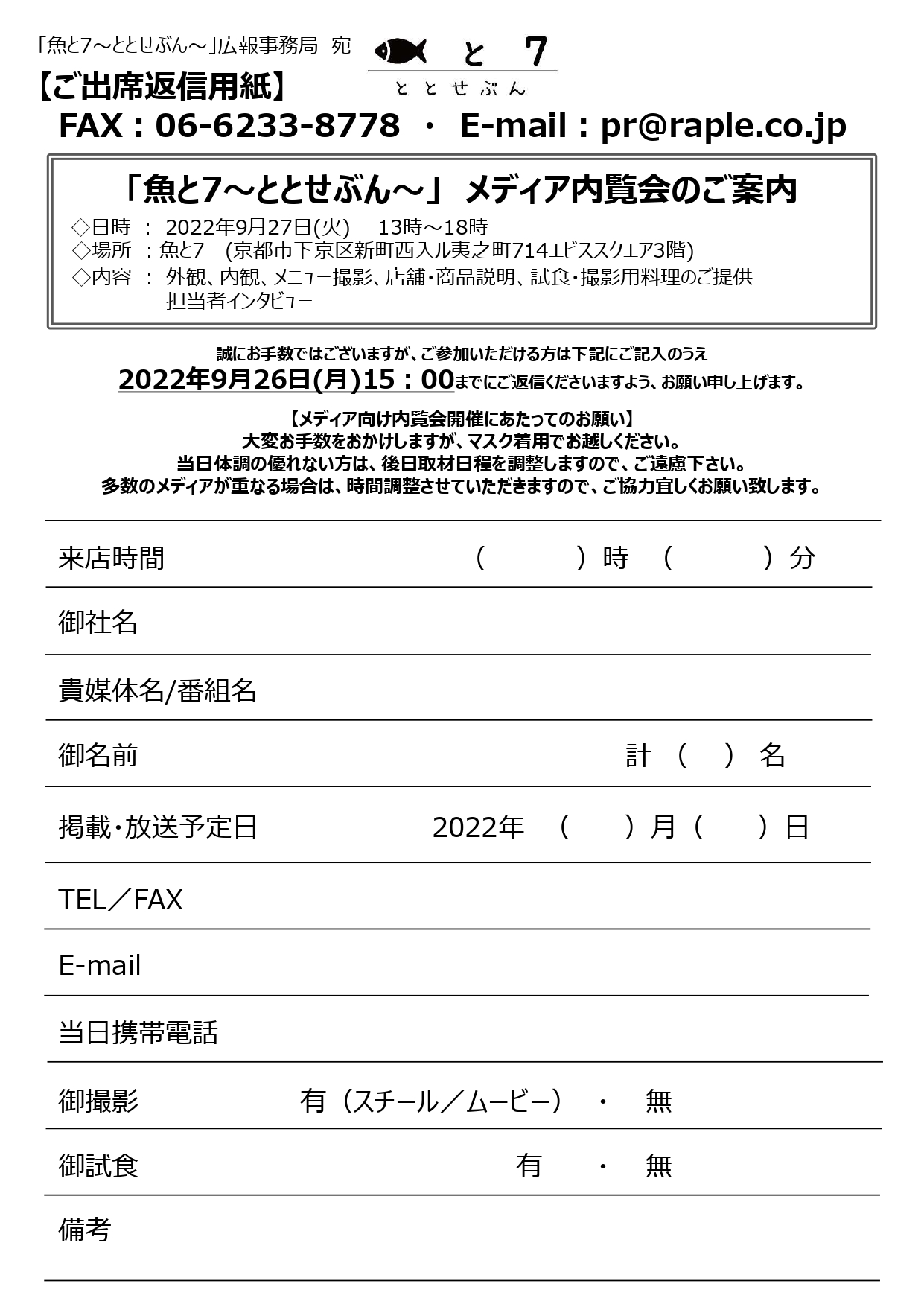 場 所 : 魚と7~ととせぶん~ (京都市下京区新町西入ル夷之町714エビススクエア3階)