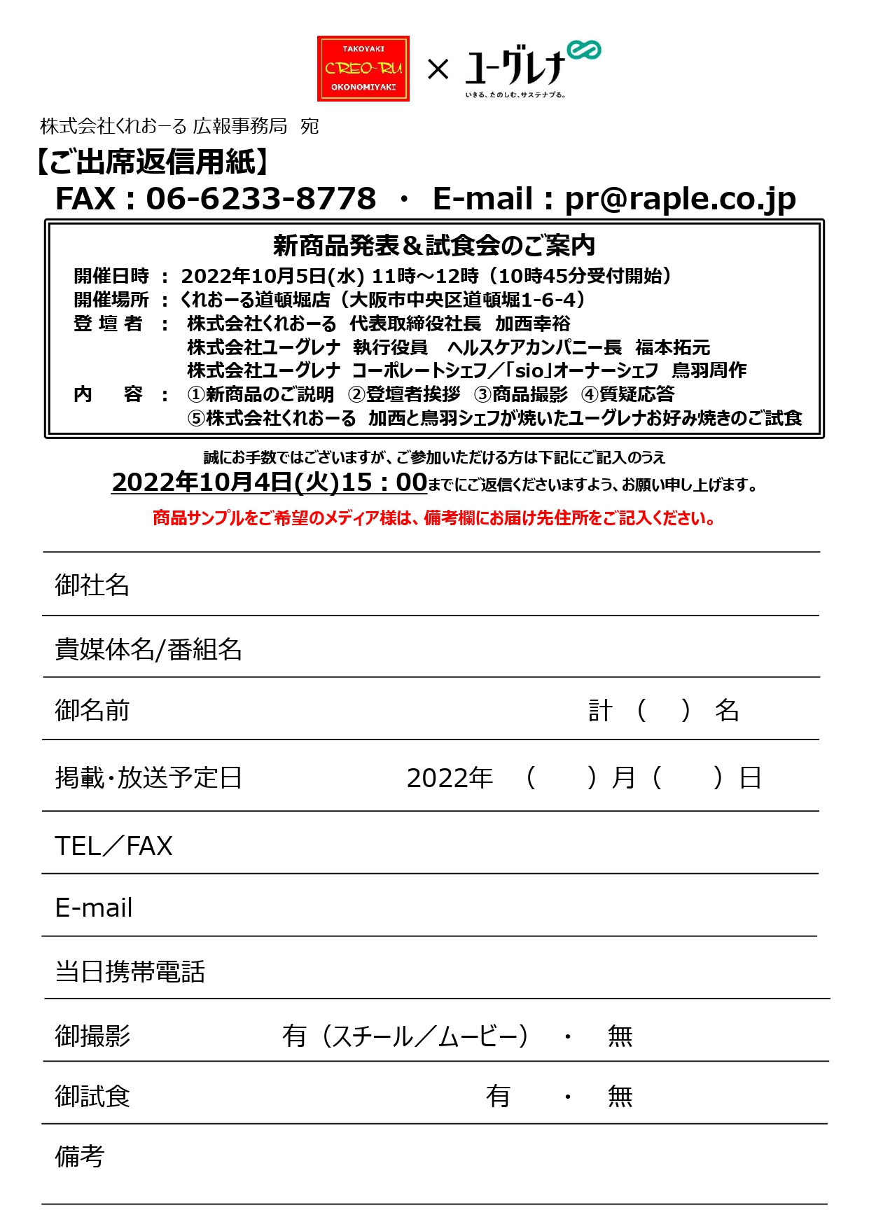 手焼きした本格的なお好み焼きを冷凍でお届けし、電子レンジで温めるだけでお手軽に召し上がっていただけます。新商品の発売を記念し、大阪・道頓堀と東京・渋谷のたこ焼き・お好み焼き店「くれおーる」で焼きたてのユーグレナ入りお好み焼きを期間限定で提供します。詳細は、10月5日(水)配信のプレスリリースで発表いたします。