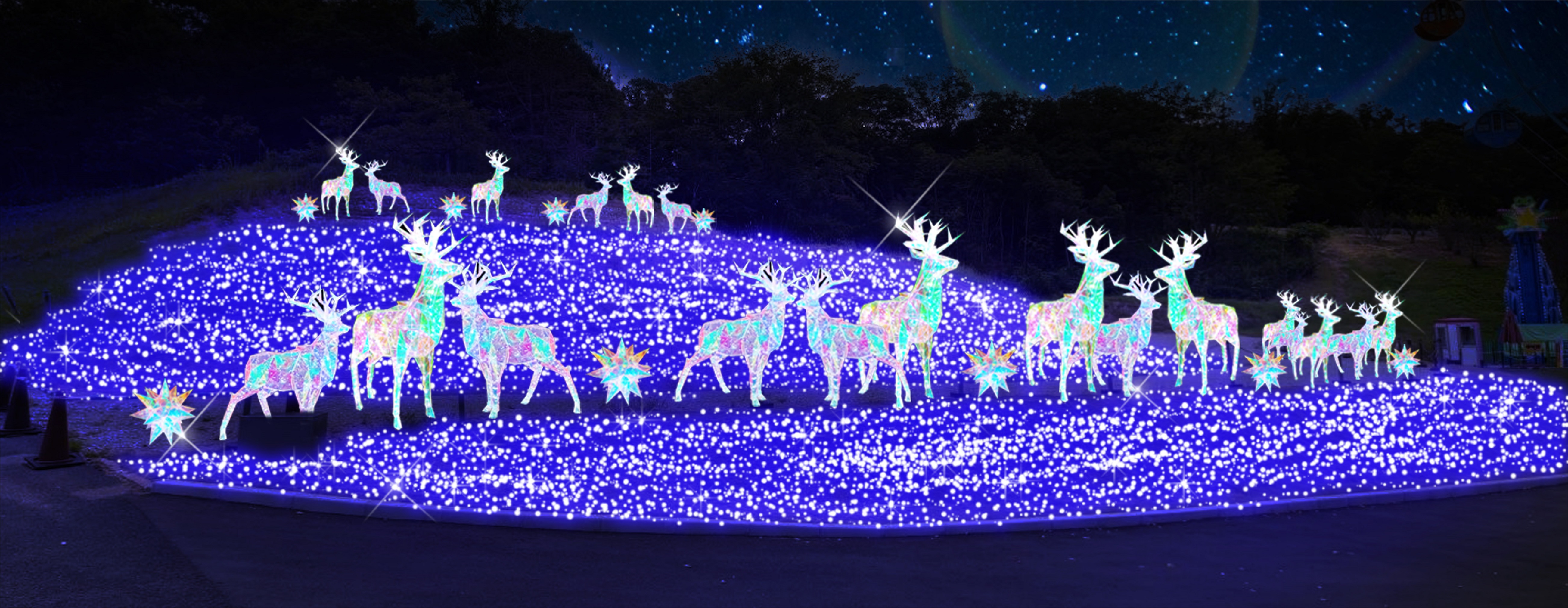 幻想的な雪の世界や北極圏に住むトナカイをイルミネーションで再現しています。