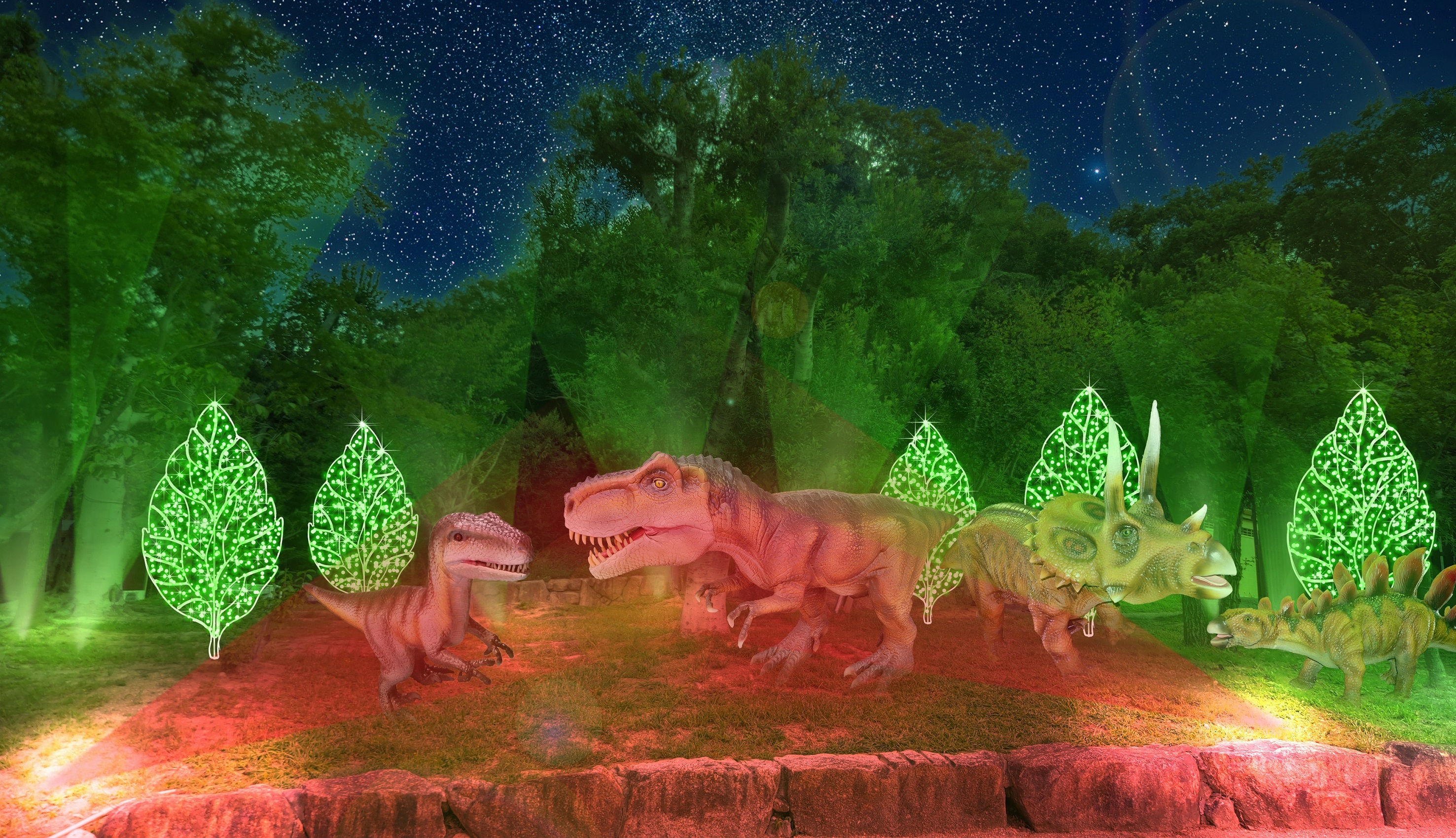 動く恐竜が出現し、太古の森に迷い込んだような迫力あるイルミネーションを体験できます。