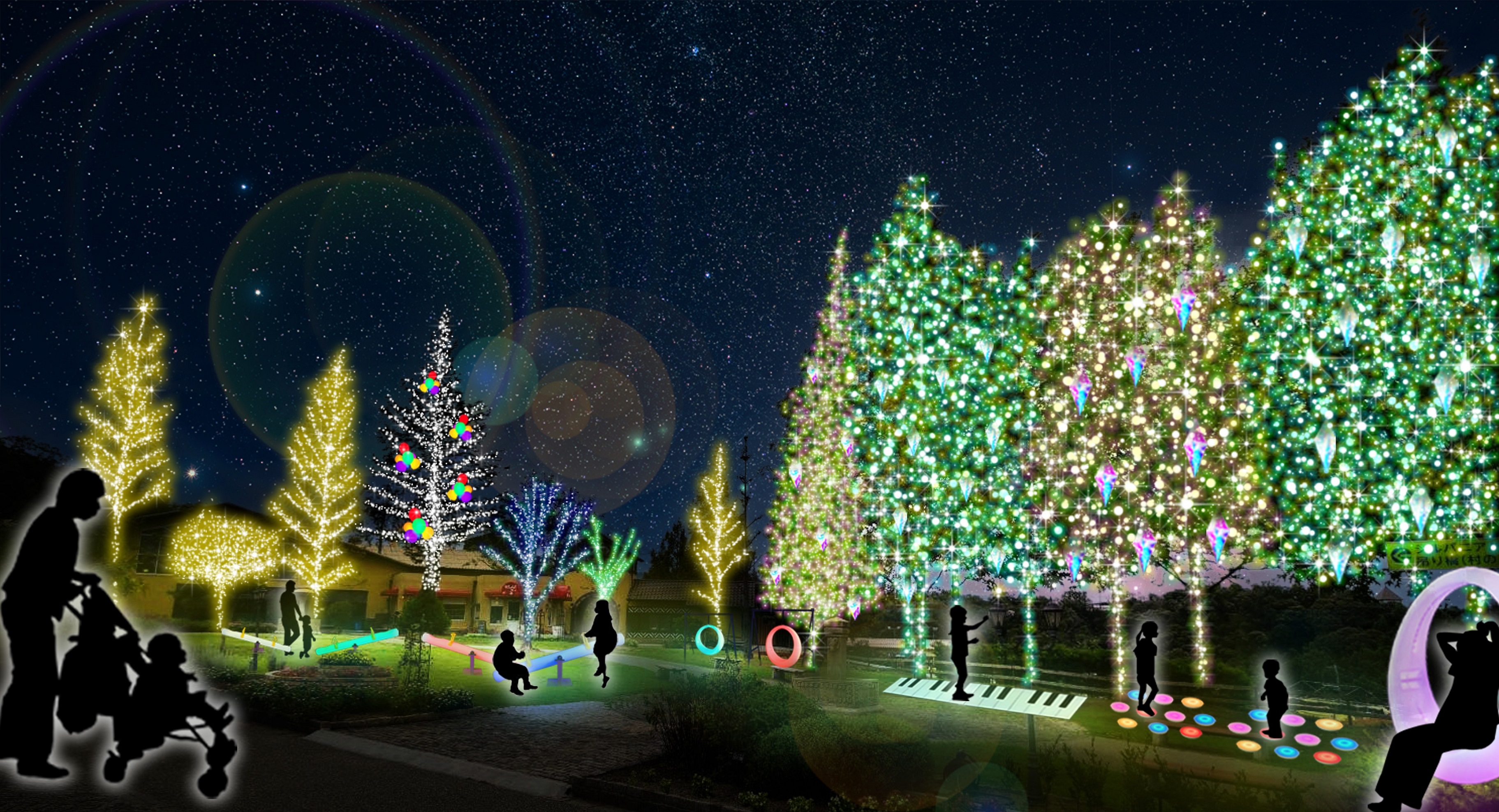 光り輝くメタセコイアの街路樹に囲まれた広場には、光るブランコやシーソーのほか、鍵盤や円形のライトを踏むと